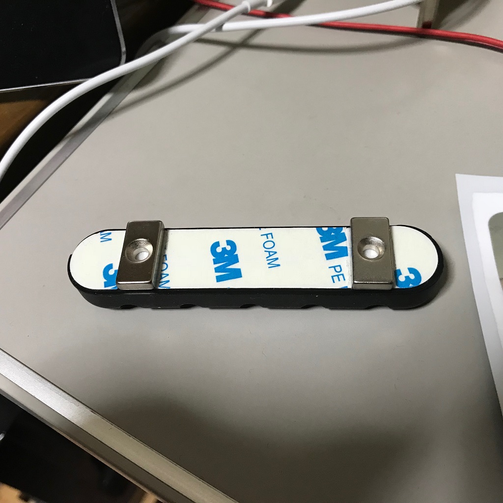現物が届いて、両面テープで固定するタイプであることに気付いた。 あまり机に両面テープで固定したりしたくない。 しばらく考えて、手持ちのネオジム磁石を2個両面テープ貼り付け、 これで固定することにする。良い感じだ。