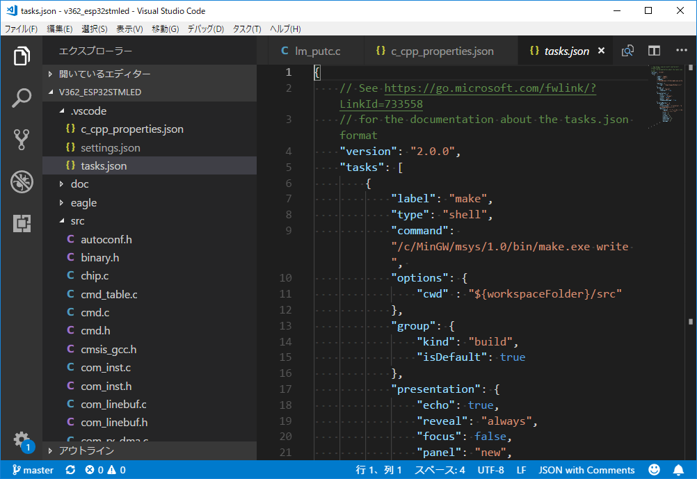 まず、vscodeからmakeコマンドの起動。 タスクの構成で、 tasks.jsonファイルを 以下のように設定することで何とかなった。