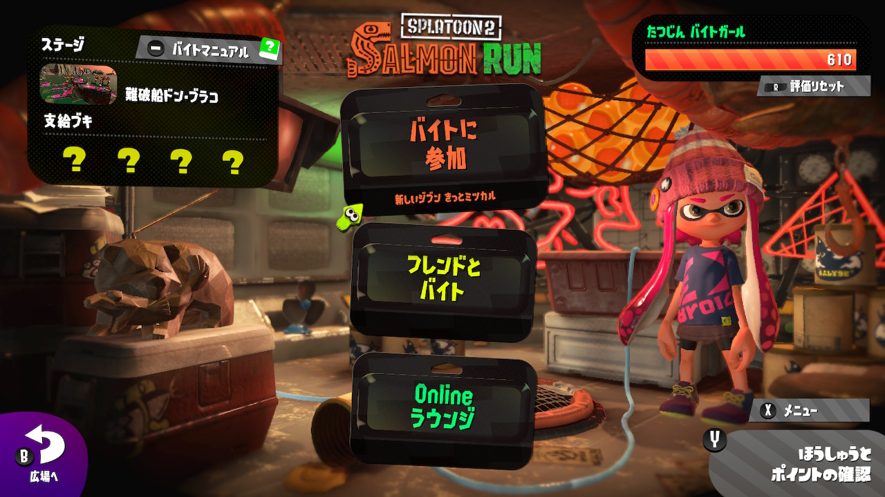 今回もカンスト目指して頑張ったが 最大評価ポイント610で終了。 前回は660ポイントだったので、 後退している? いやいや、前回はトキシラズいぶし工房で 今回は難破船ドン・ブラコだったので ステージのせいだろうと思っている。 ほとんど上手くなっていないのは間違いない。