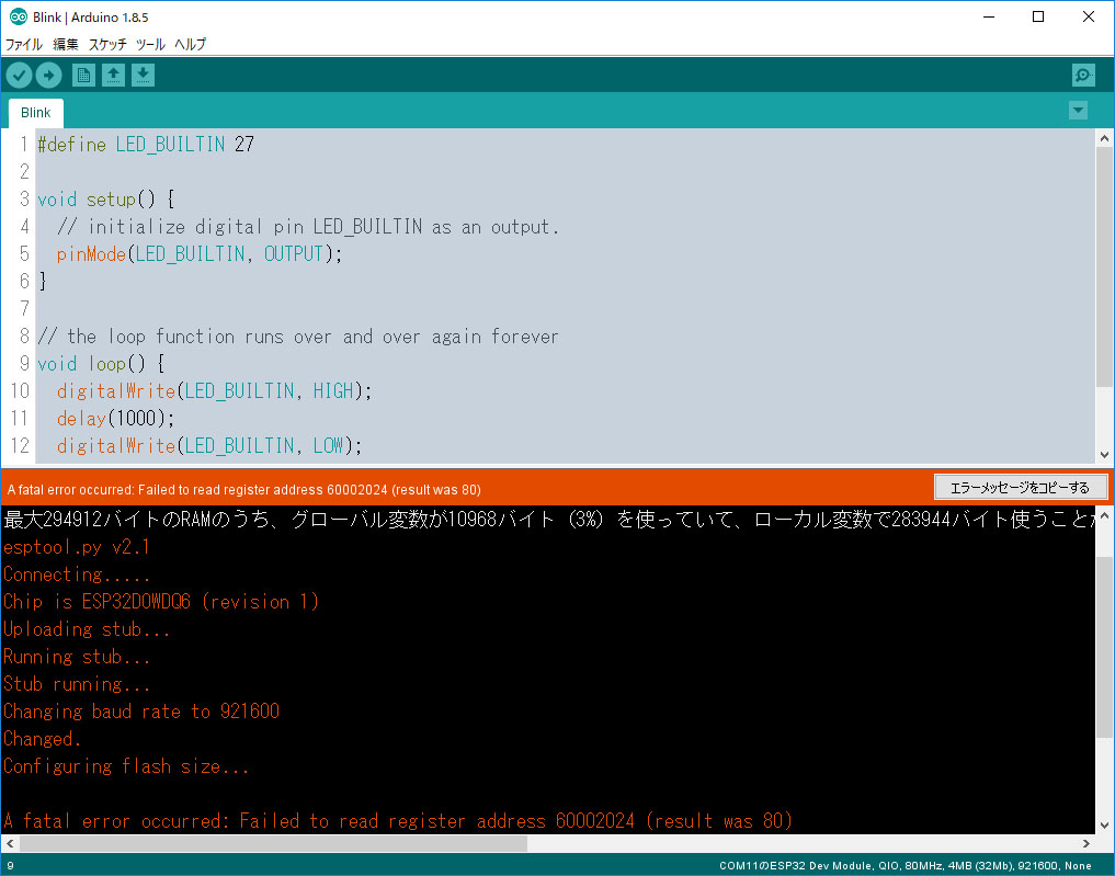 久しぶりに作ったESP32のボードに arduinoでプログラムを書き込もうとしたら 失敗。 esptoolでエラーになっている。