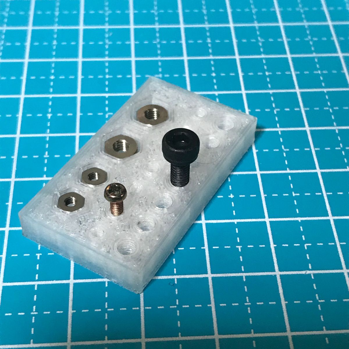 3Dプリンタで、様々なサイズの穴を開けた サンプルを作成し、ネジ穴代わりになる穴系を探した。