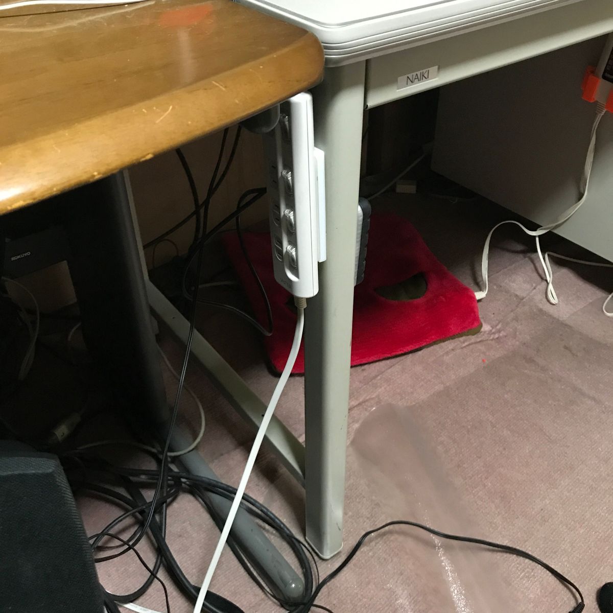 ということで試しに1個購入したものが 届いたので早速テーブルタップを机の 足に仮固定。両面テープが強力なので 間違えて貼ってしまうと修正できないかもしれないので 注意が必要だ。