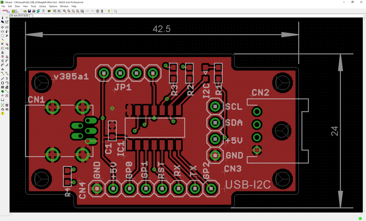 作ったのは USB - I2Cのアダプタ。 Microchip社のMCP2221AにUSBコネクタとI2Cのコネクタを 付けただけ。 USB-I2Cアダプタは市販のものも2千円未満であるし、 MCP2221Aの評価ボードも2千円台で売っている。 なのに自分で作りたいのは、直接 GROVEのケーブルが生えている アダプタが欲しいからだろうか、それとも基板を作りたいだけだろうか。