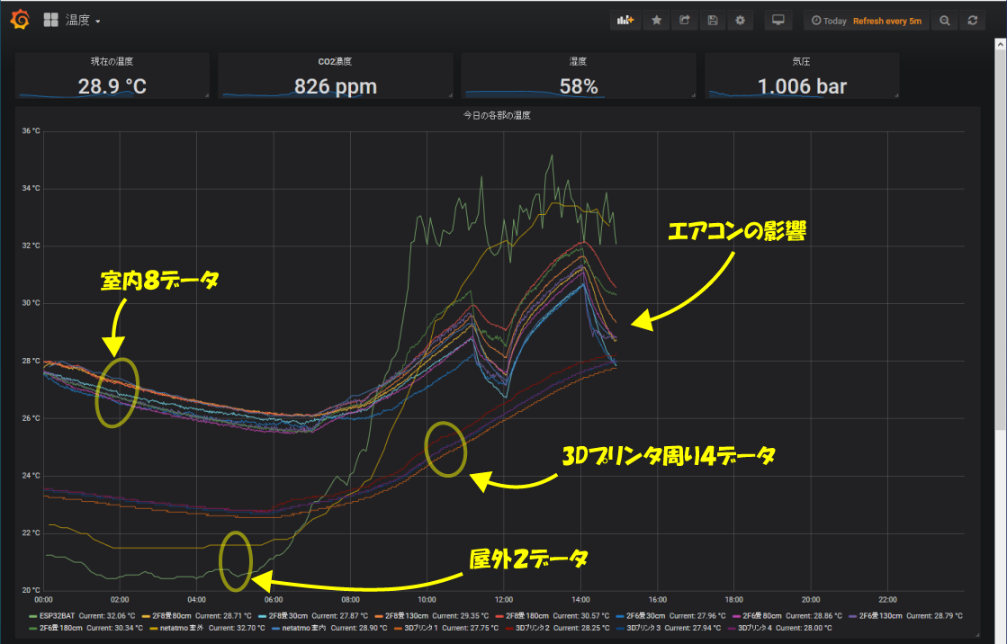 昔から室温の計測に興味があって、 なんやかんやと計測してきた。 現在は15個の温度(室内13,屋外2)を計測し、 grafanaでグラフ化している。 grafanaは汎用のグラフ化ツール。 汎用ってどうよ、と思っていたが すぐにグラフ化できるのは便利だ。