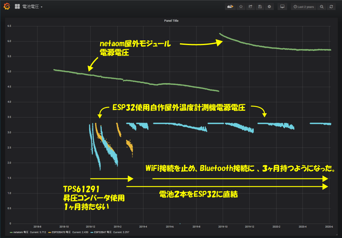 防水性は完璧で気に入ったのだが、 実際に動作させると電池の寿命が1ヶ月も無い。 TPS61291昇圧コンバータの使用を止め、 電池の直接駆動に切り替えるが、 あまり変化は無く。 WiFi接続を止め、Bluetooth接続に 切り替えたら、3ヶ月程度持つようになったので、 そのまま運用している。 温度と一緒に電池電圧の変化も記録している。 グラフを以下に示す。