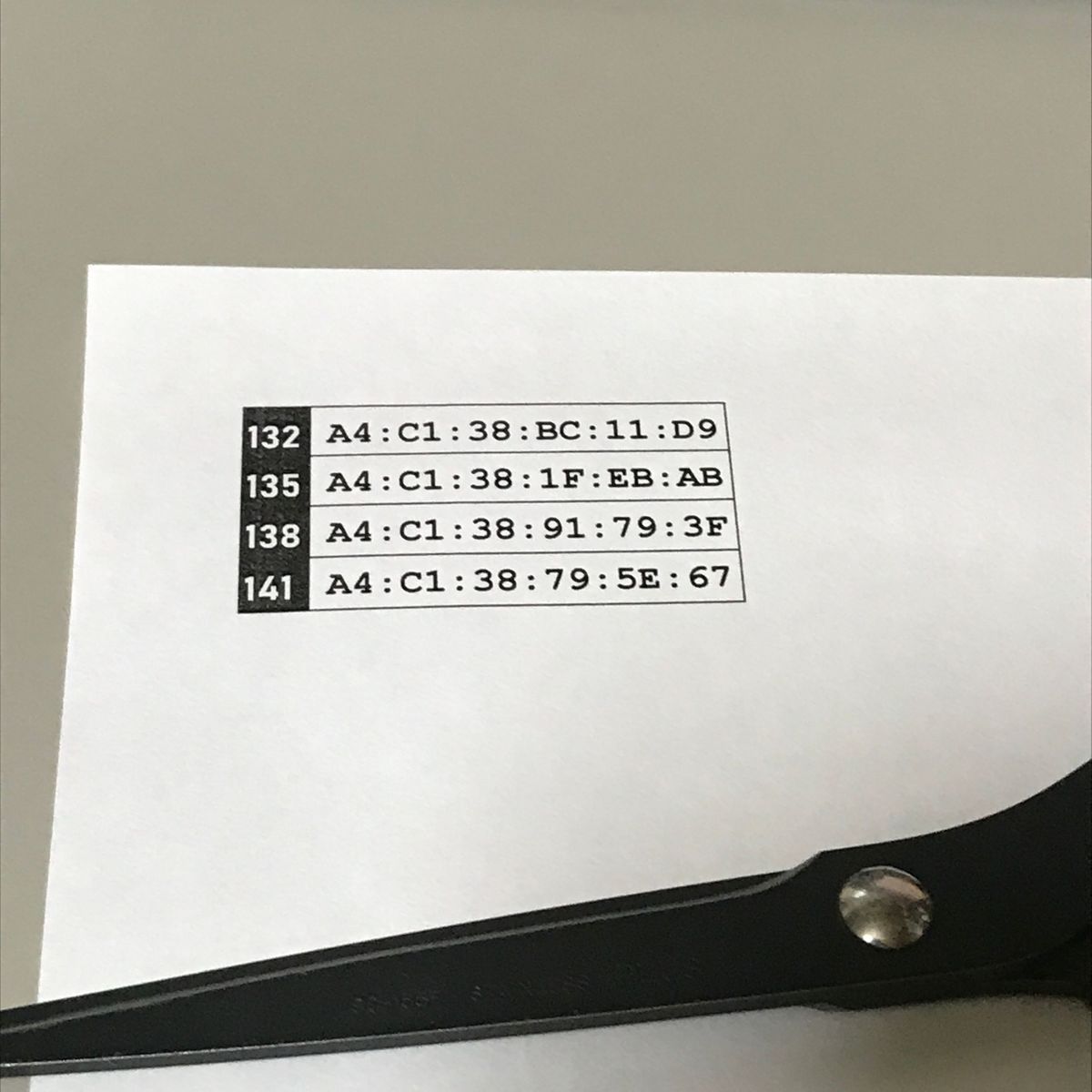 調べたMACアドレスと割り当てたセンサーID(番号)を印刷し、 両面テープでXIAOMI湿度計に貼り付けた。
