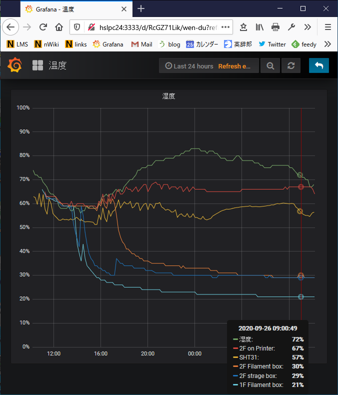 前にも書いたが Mysqlに書き込んだデータは grafanaでグラフ化し ブラウザで見る。 昨晩、湿度計を設置したあとのグラフを以下に示す。