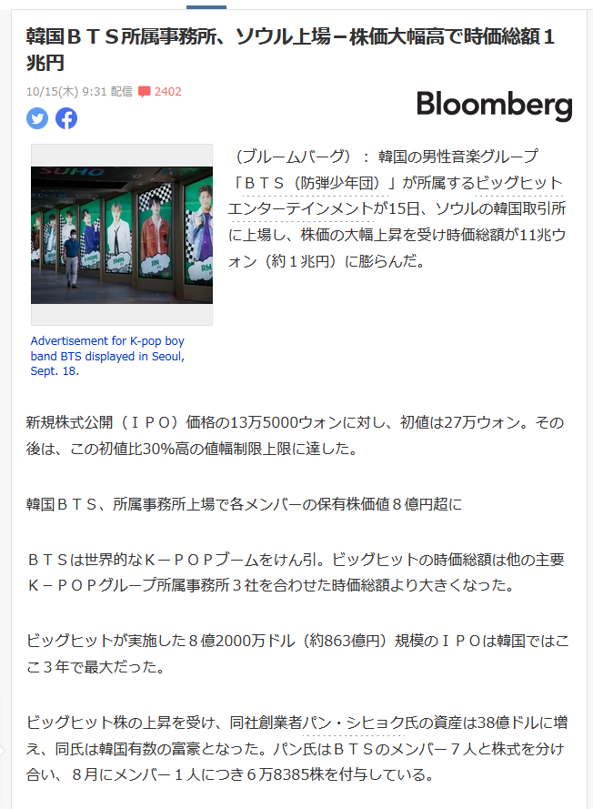 韓国BTS所属事務所、ソウル上場-株価大幅高で時価総額1兆円(Bloomberg) - Yahoo!ニュース (ブルームバーグ): 韓国の男性音楽グループ「BTS(防弾少年団)」が所属するビッグヒットエンターテインメントが15日、ソウルの韓国取引所に上場し、株価の大幅上昇を受け時価総額が11兆ウォン(約1兆円)に膨らんだ。