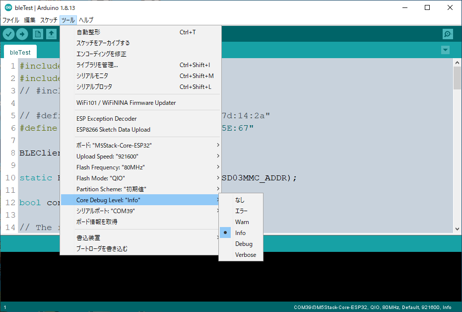 arduino-esp32のライブラリのソースを見ると log_e()やlog_v()で 各種メッセージが出力されている (例)。 これらのメッセージは Arduino IDEだと メニューのツール→Core Debug Levelで設定で 出したり出さなかったりできる。