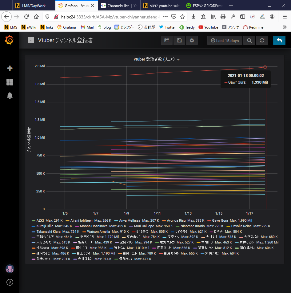 カーソルを合わせれば数値は表示されるので 登録者数を調べるのは早くなった。 微妙なところを拡大とかはgrafanaで出来ないので そういう表示プログラムを自作しても良いかも知れない。