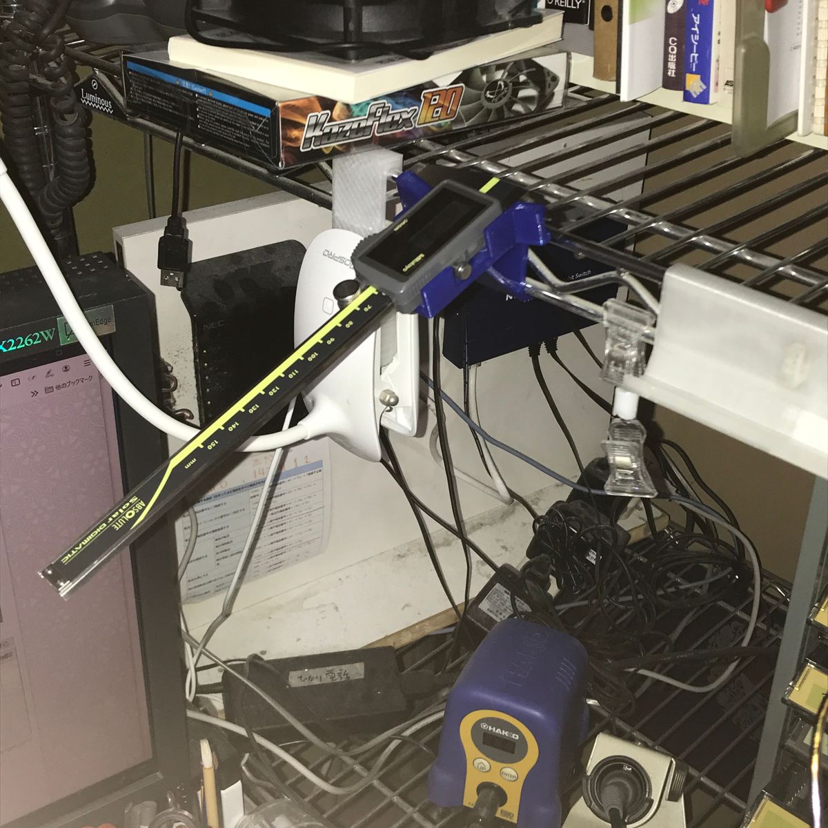 組み立ててラックのフレームに取り付けノギスを置いてみたところ