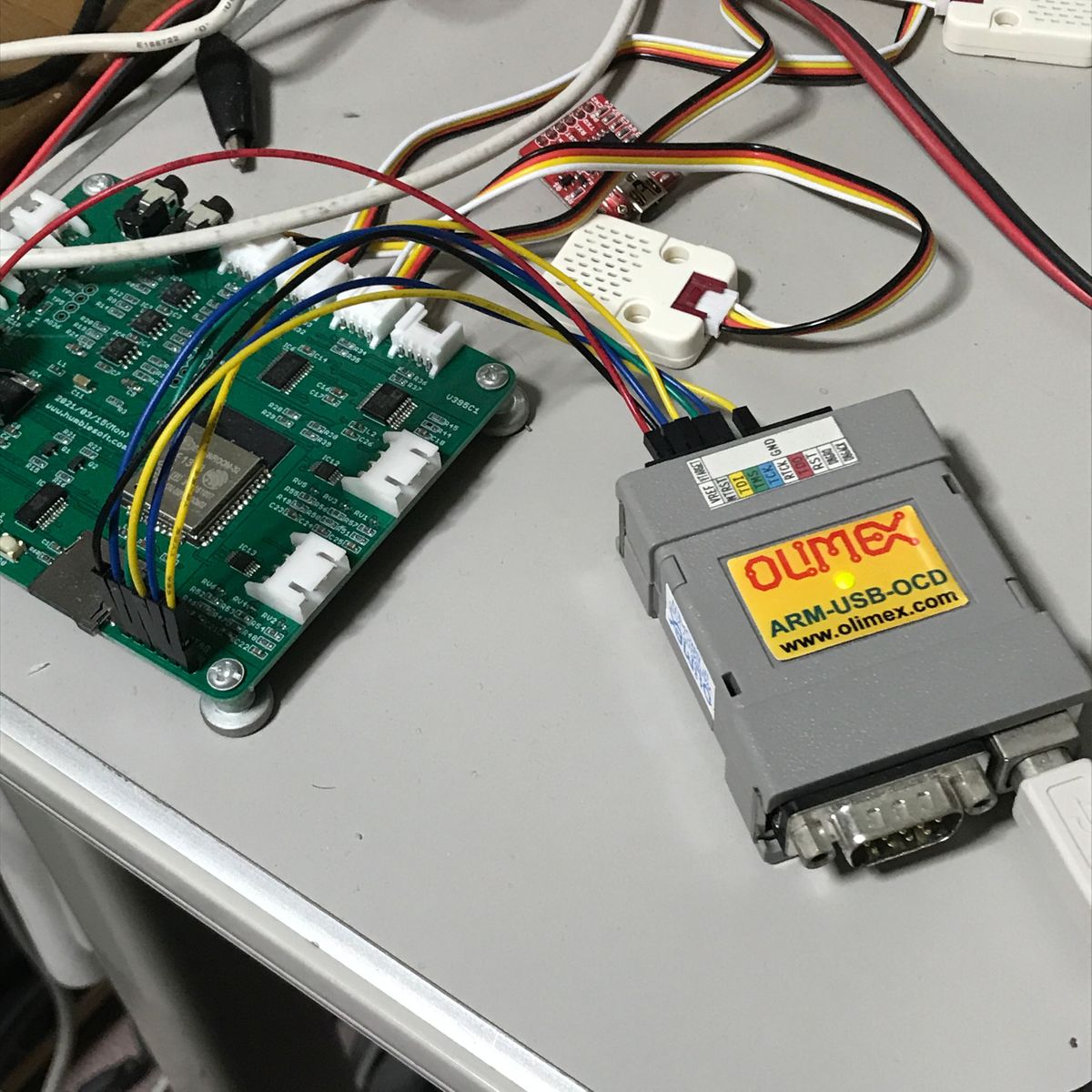出来上がった基板にJTAGでのプログラム書き込みを 試すが上手く行かない。使用したJTAGアダプタは Olimex ARM-USB-OCD。 platformioを使っているので、platformio.iniに