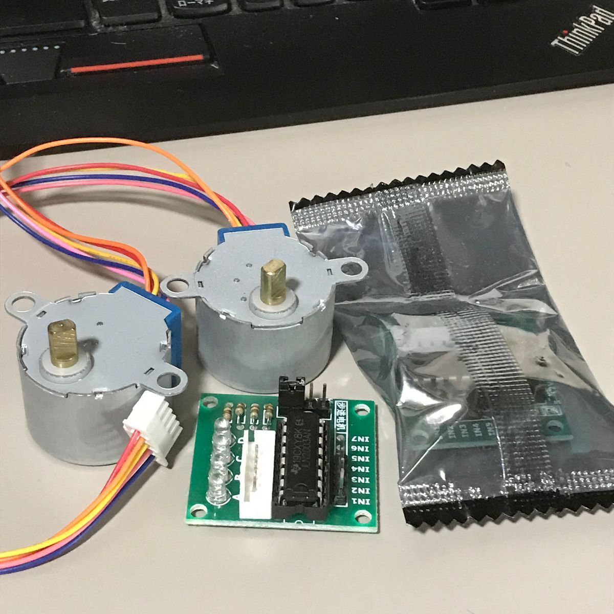 AliExpressでも見かける 安いステッピングモータ 28BYJ-48と ULN2003のドライバ基板のセットを アマゾンから買ってみた。 2セットで599円。 速度とパワーの感じを見たい。