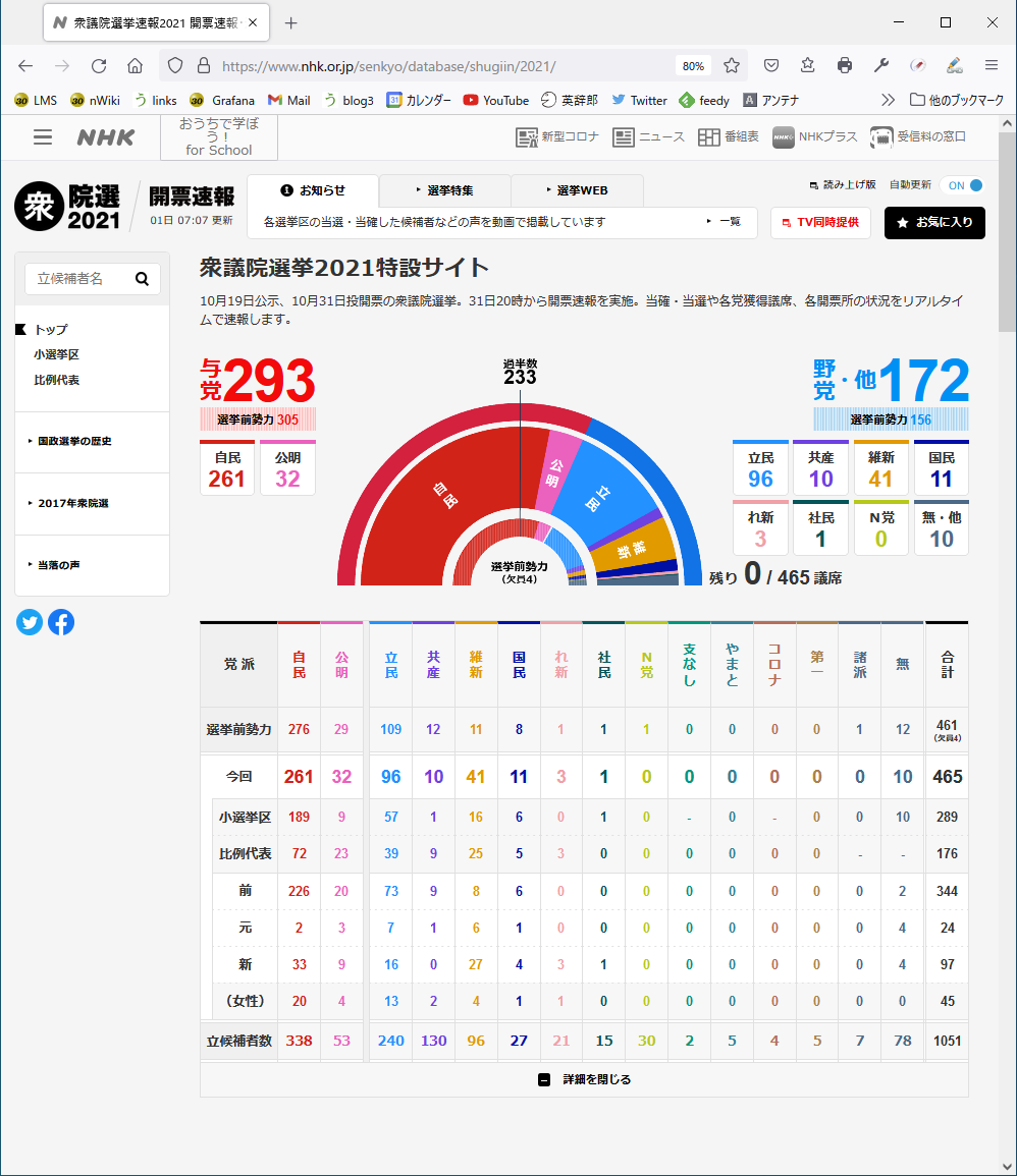 選挙結果はNHKのサイトが見やすい。 衆議院選挙速報2021 開票速報・選挙結果 -衆院選- NHK。 このサイトを残してくれれば便利だと思うのだが、 無くなるんだろうなぁとスクリーンコピーを取っておく。