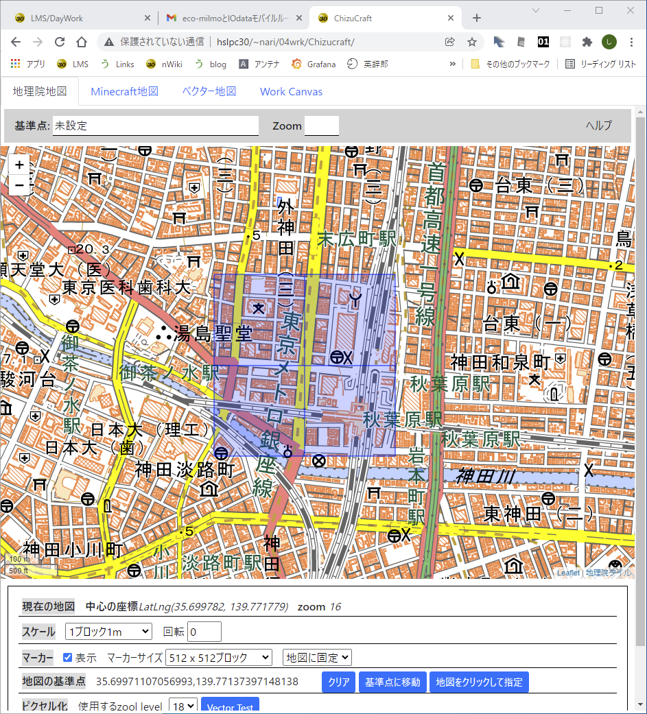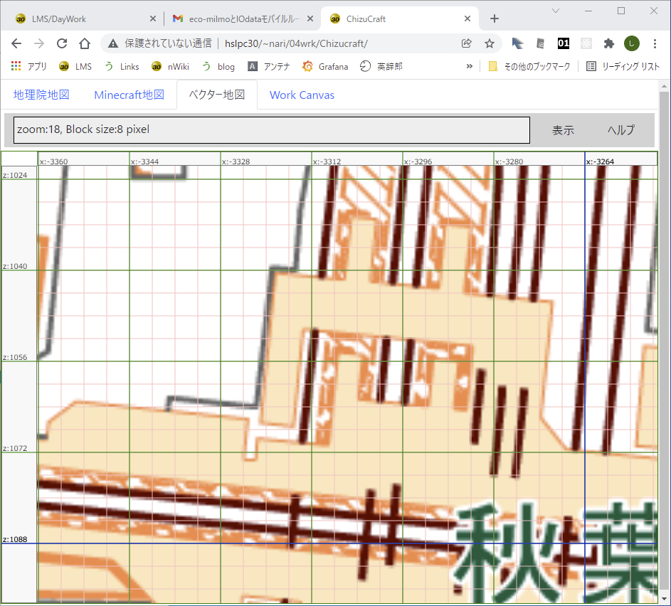 これでマイクラ側での作業が可能になったので 自分のワールドでバーチャル・秋葉原の作成を開始したが、 地図が見にくい。画像を拡大しているので 線がにじむのだ。にじんでいる、どの部分を線として採用するかに 悩んでしまう。 この時点で ベクトルタイルの提供実験に気がつく。 ベクトルデータを描画してやればにじまない。