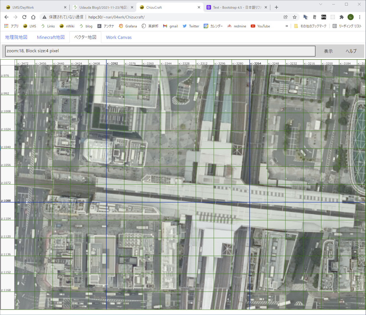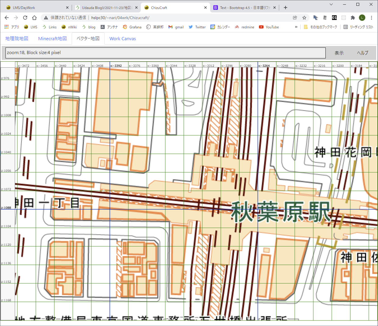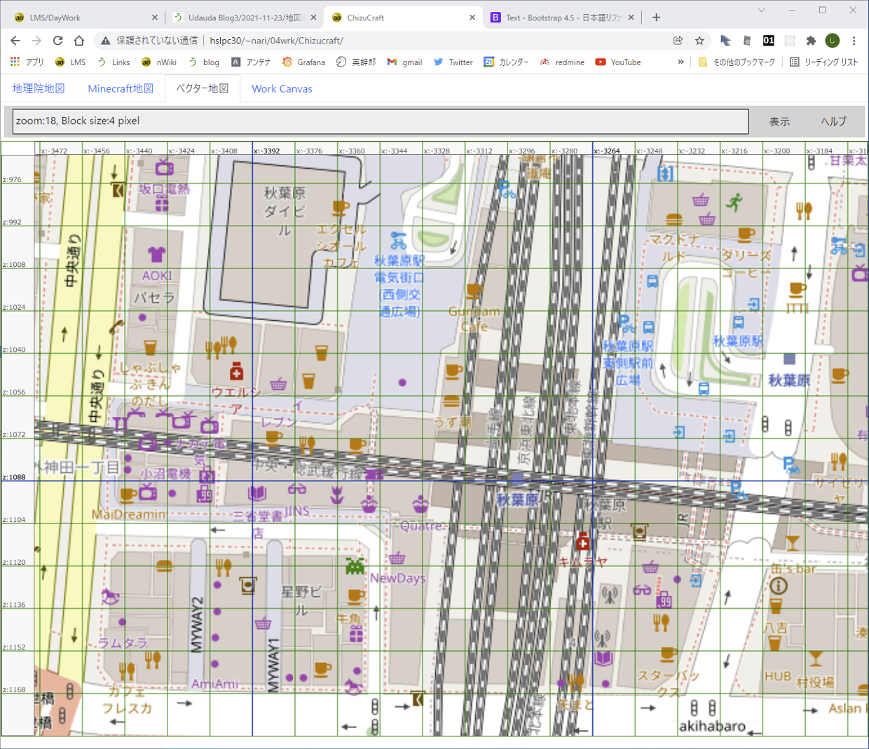 基準点の座標を基準にタイルの画像を取得、 canvasに描画し、ブロック単位のグリッド(1m,4m,16m,128m)も 描画するプログラムを作成した。マイクラ座標とのオフセットも 設定できるのでマイクラのx,z座標も表示している。