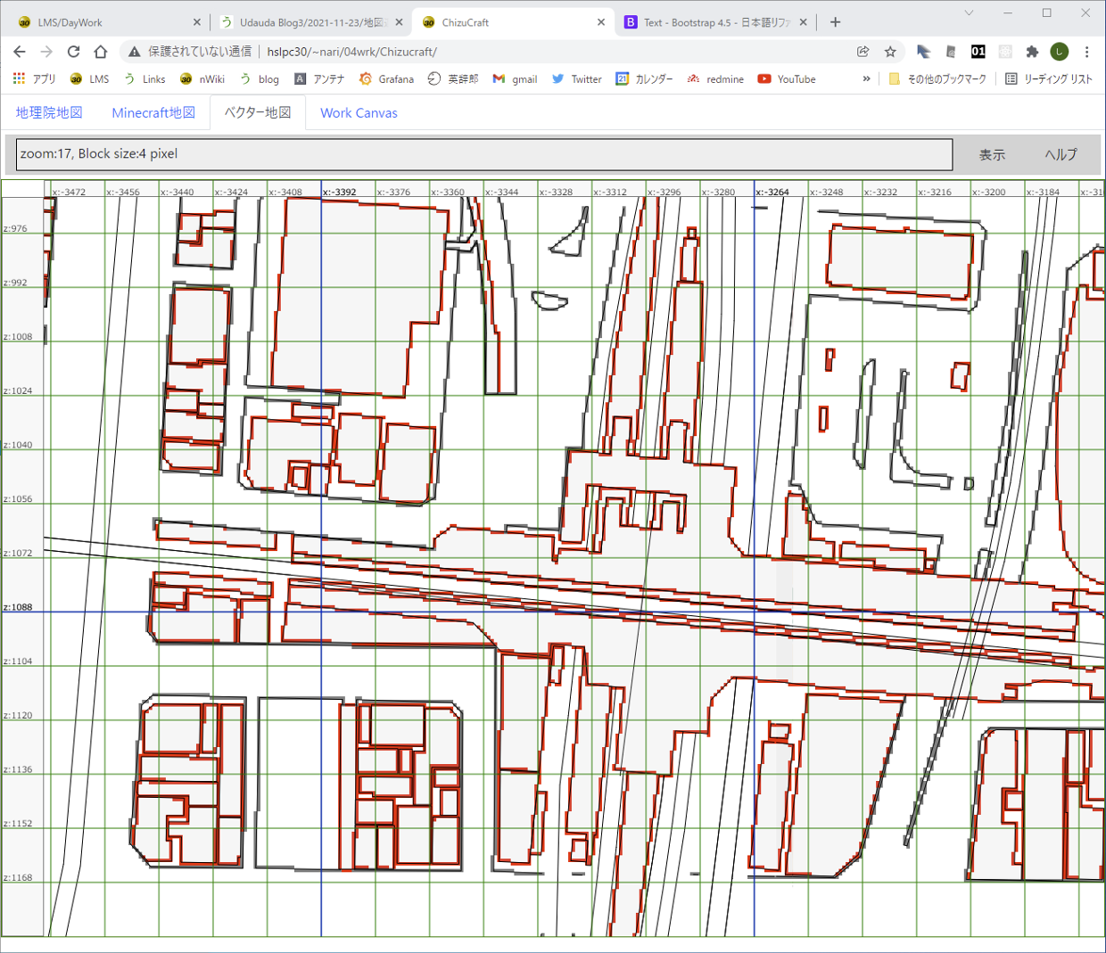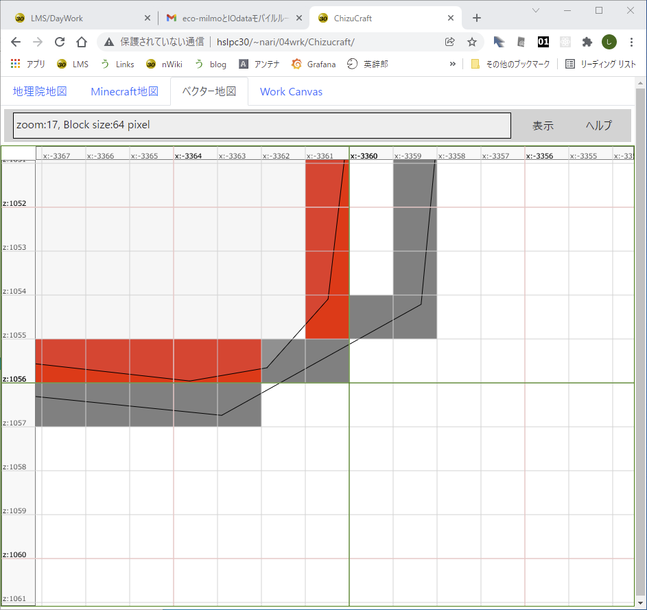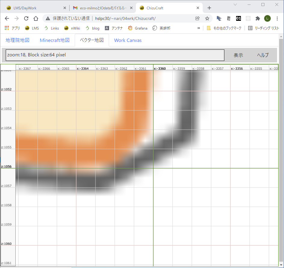 基準点の座標を基準にタイルの画像を取得、 canvasに描画し、ブロック単位のグリッド(1m,4m,16m,128m)も 描画するプログラムを作成した。マイクラ座標とのオフセットも 設定できるのでマイクラのx,z座標も表示している。