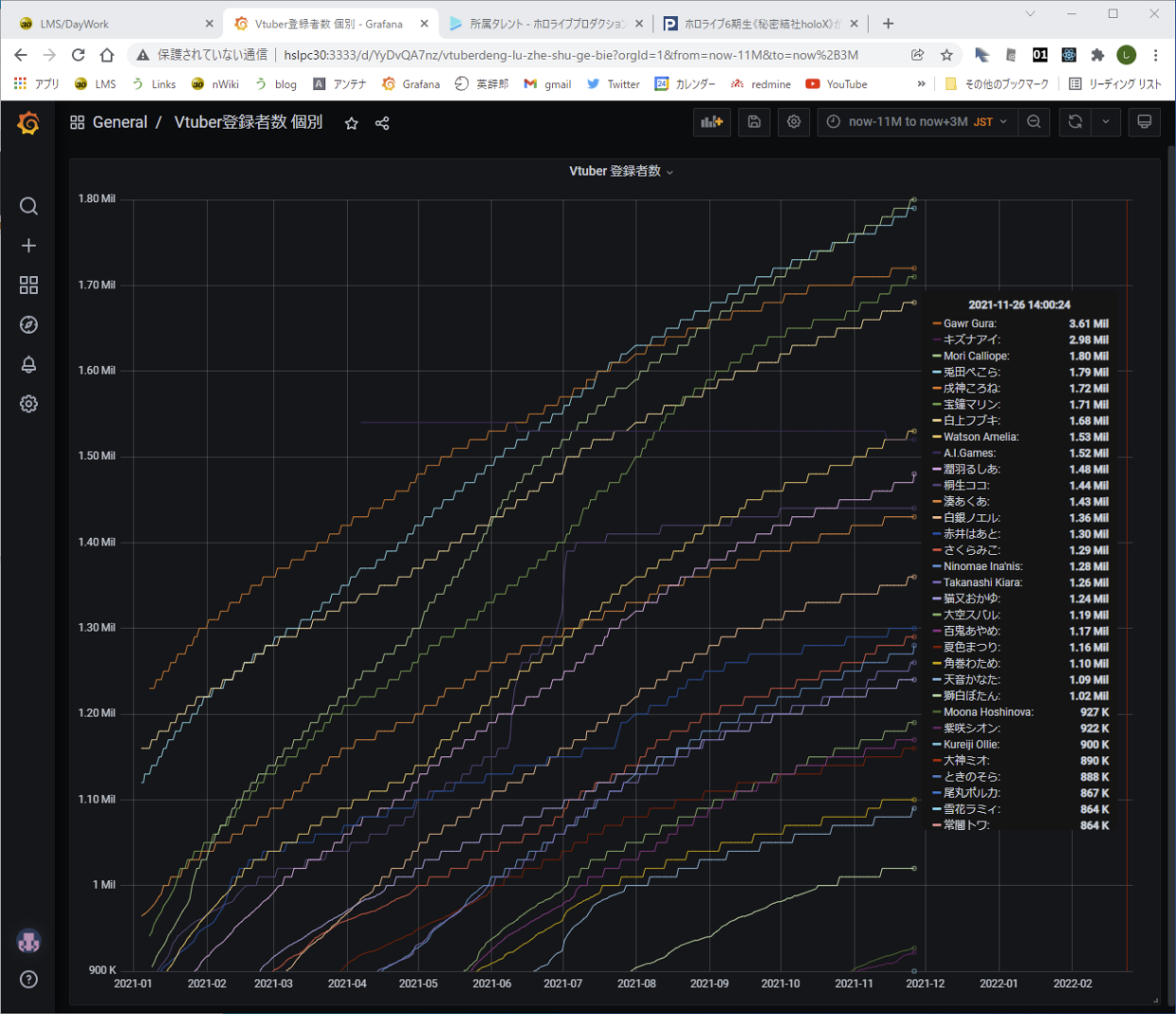 Vtuberの登録者数をグラフ化し 監視しているものとしては、 デビュー直後の登録者数の変化は見逃せない。 5人のチャンネルを登録し記録を開始した。