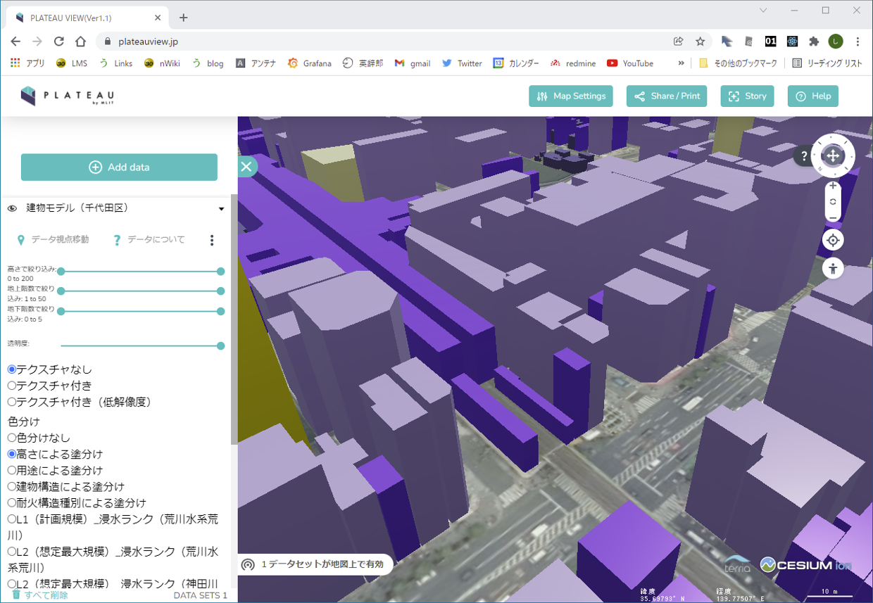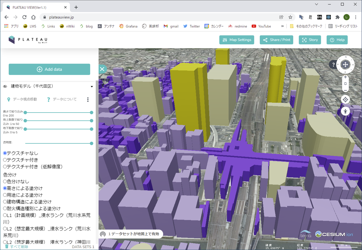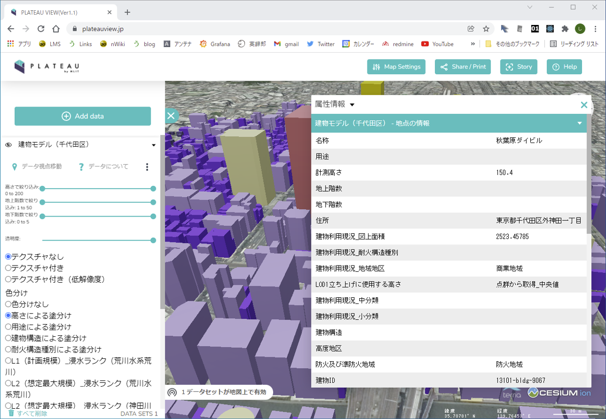 まっ平らな世界にも飽きてきたので いくつか建物を作りたい。 特に秋葉原駅や鉄道の高架など作りたい。 それには建物のデータが必要になるわけだが、 アプリで使える日本国内の地形/建物の3Dモデルをつくる という記事で建物の3Dデータが入手可能であることを知る。 また変換ツールが必要か?と思ったが plateauviewというツールで 3Dモデルを見ることができる。 建物の輪郭に高さの情報を加えただけのもののように見えるが十分だ。 これで建物の概形をつくることができる。 残念なことに秋葉原中央通りの総武線高架のデータは入っていない。 近くの建物の高さを参考にするしかなさそうだ。
