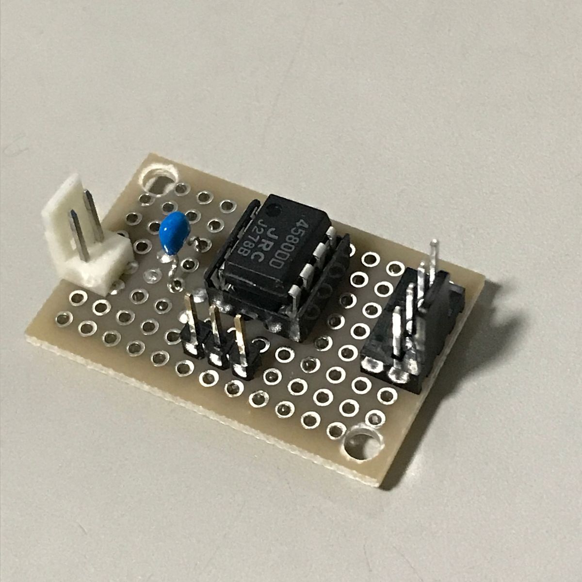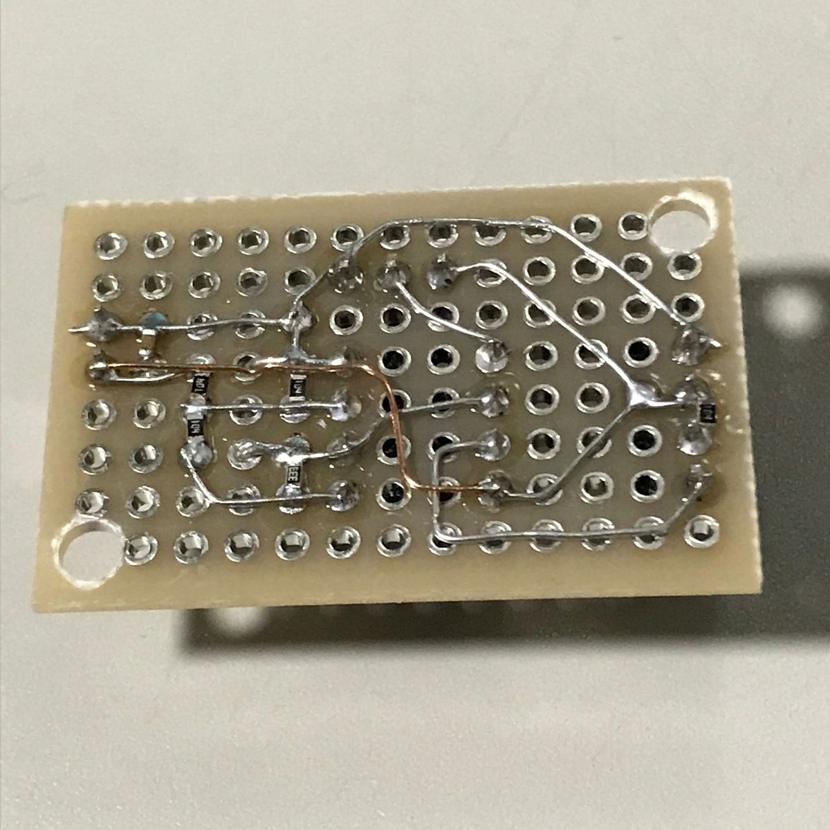 ブレッドボードで試作することも考えたが ユニバーサル基板にハンダ付けした方が楽なので いきなり作る。 基板は 秋月電子のEタイプを使用。 小さい基板が充実していて助かる。 jw_cadでユニバーサル基板の絵を書き、 拡大し印刷したものに部品と配線を書込み配置を検討。 ケースに組み込むことを考え、VRや電源コネクタは 基板には固定せず、コネクタ経由で接続する。 ほとんどの配線をスズメッキ線(ハンダメッキ線)で行い、 抵抗は 1.6 x 1.0mm のチップ抵抗を使用した。