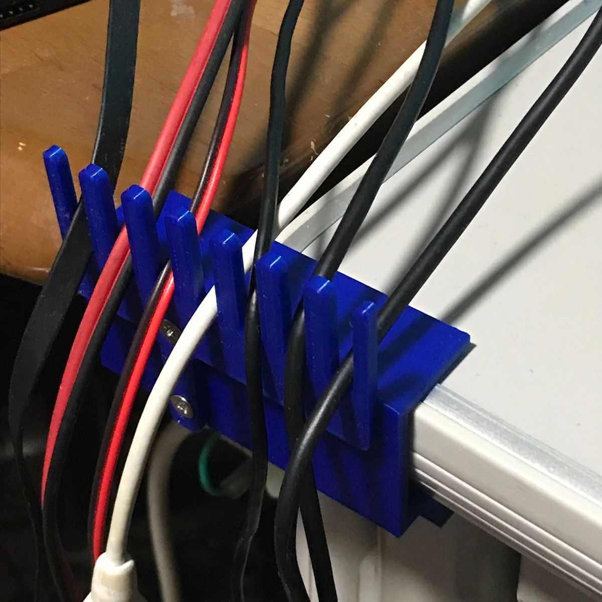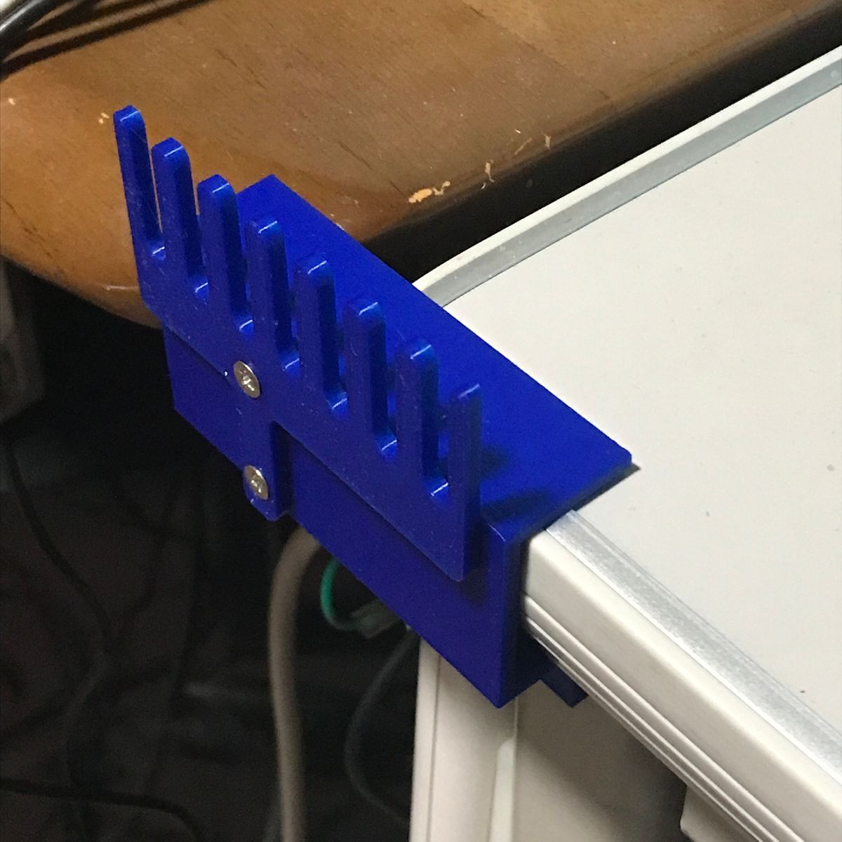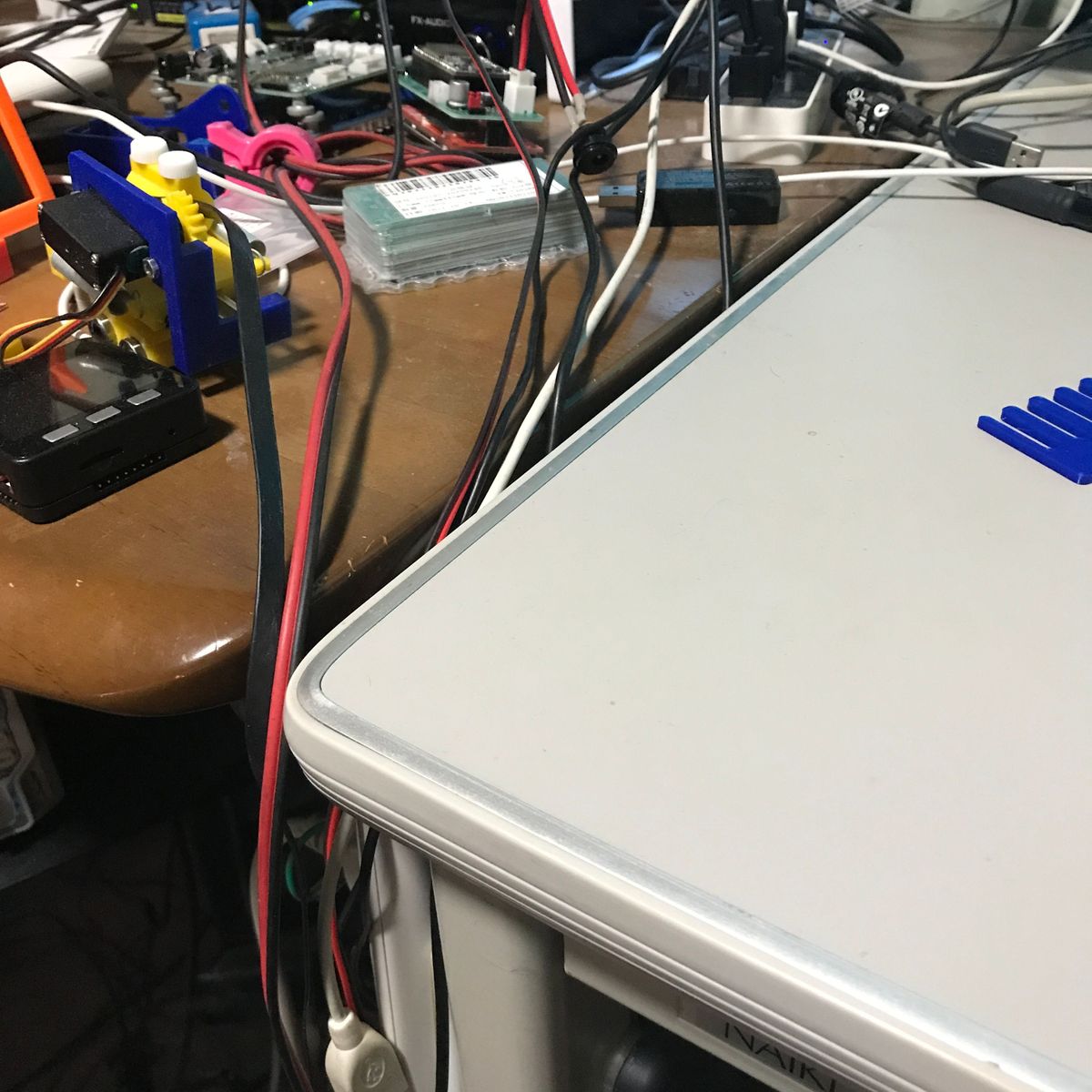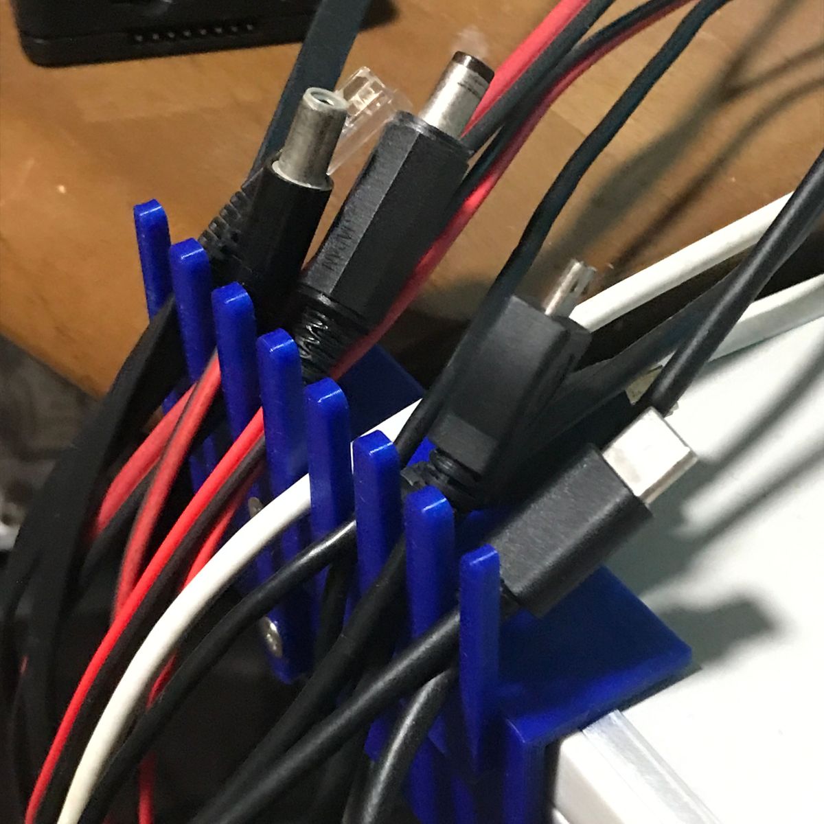 1点目はケーブルホルダ。 机の脇にUSBケーブルなどを保持するあれだ。 ケーブルホルダを作るつもりは無かったのだが、 結果としてできた物がケーブルホルダだった。 私は机の脇に10ポートのUSBハブを置き 電子工作の実験によく使うUSBケーブルを刺し 垂らしている。場所が隣の机との境界近くなので ケーブルが全部、隣の机との隙間に落ちてしまう。 使用時に取り出すのが少し面倒だし、 見た目も良くない。 隙間に蓋などすれば落ちないだろう、 いつか作ろうと思っていたが 遂に作ることにした。