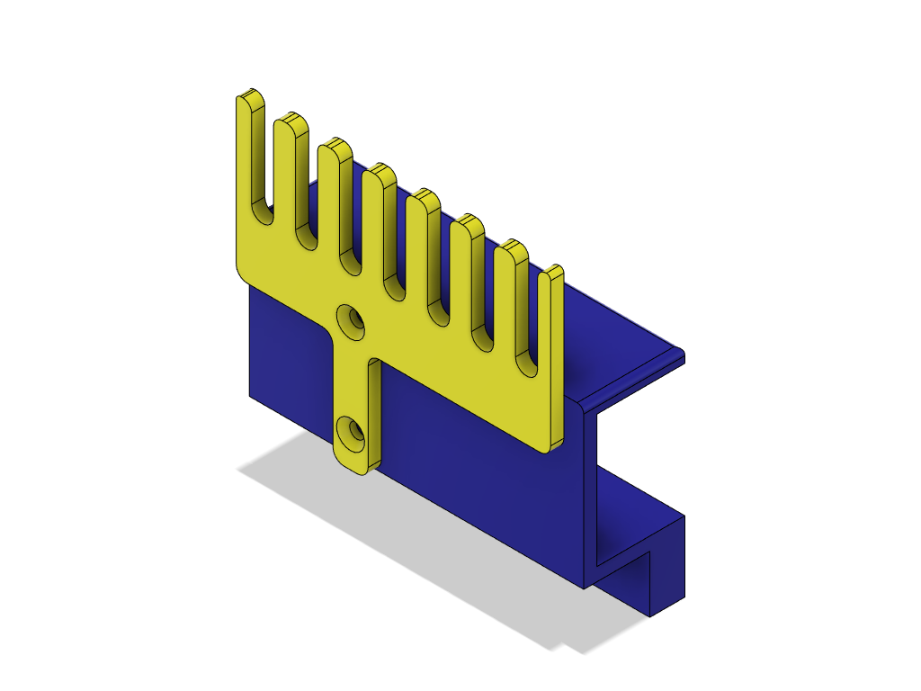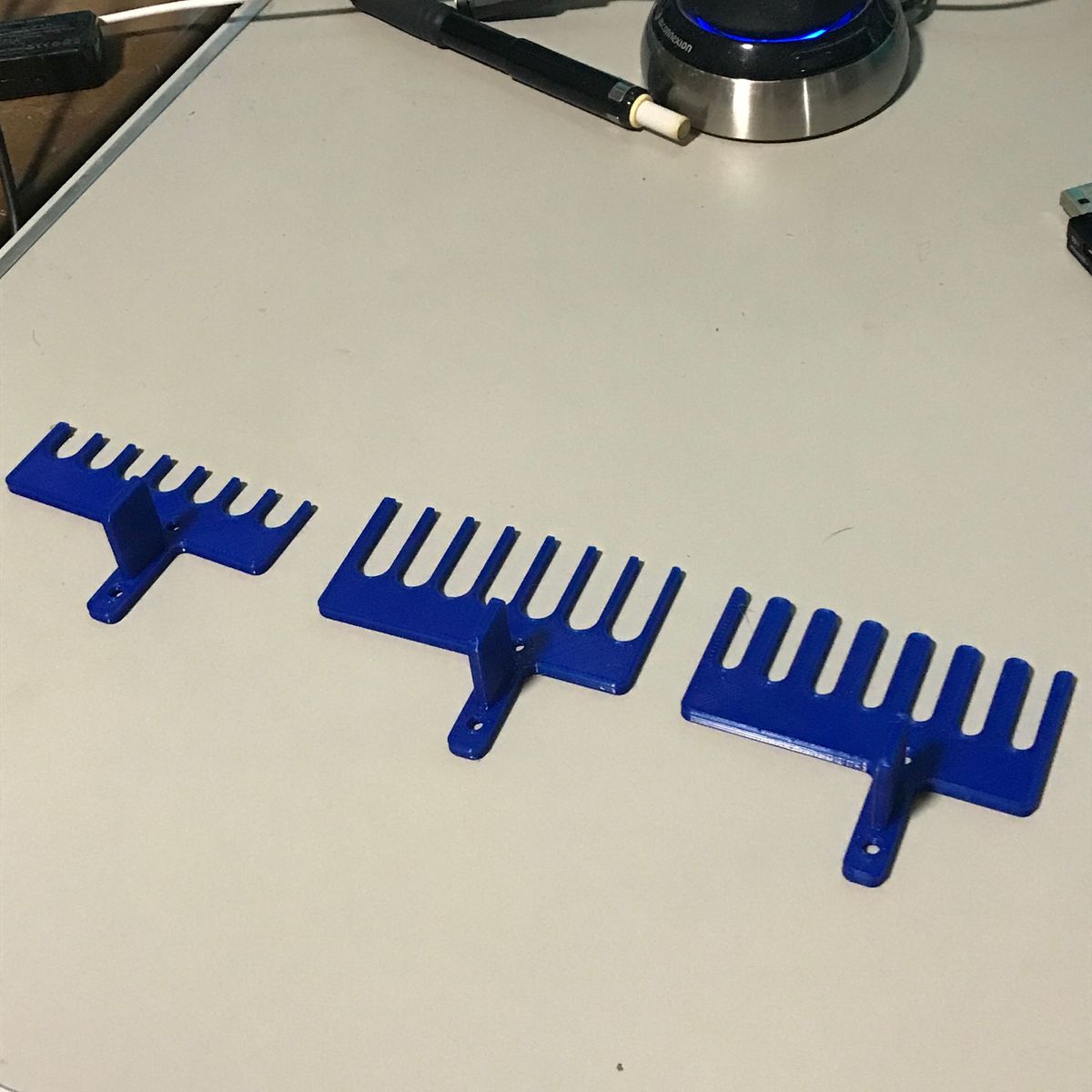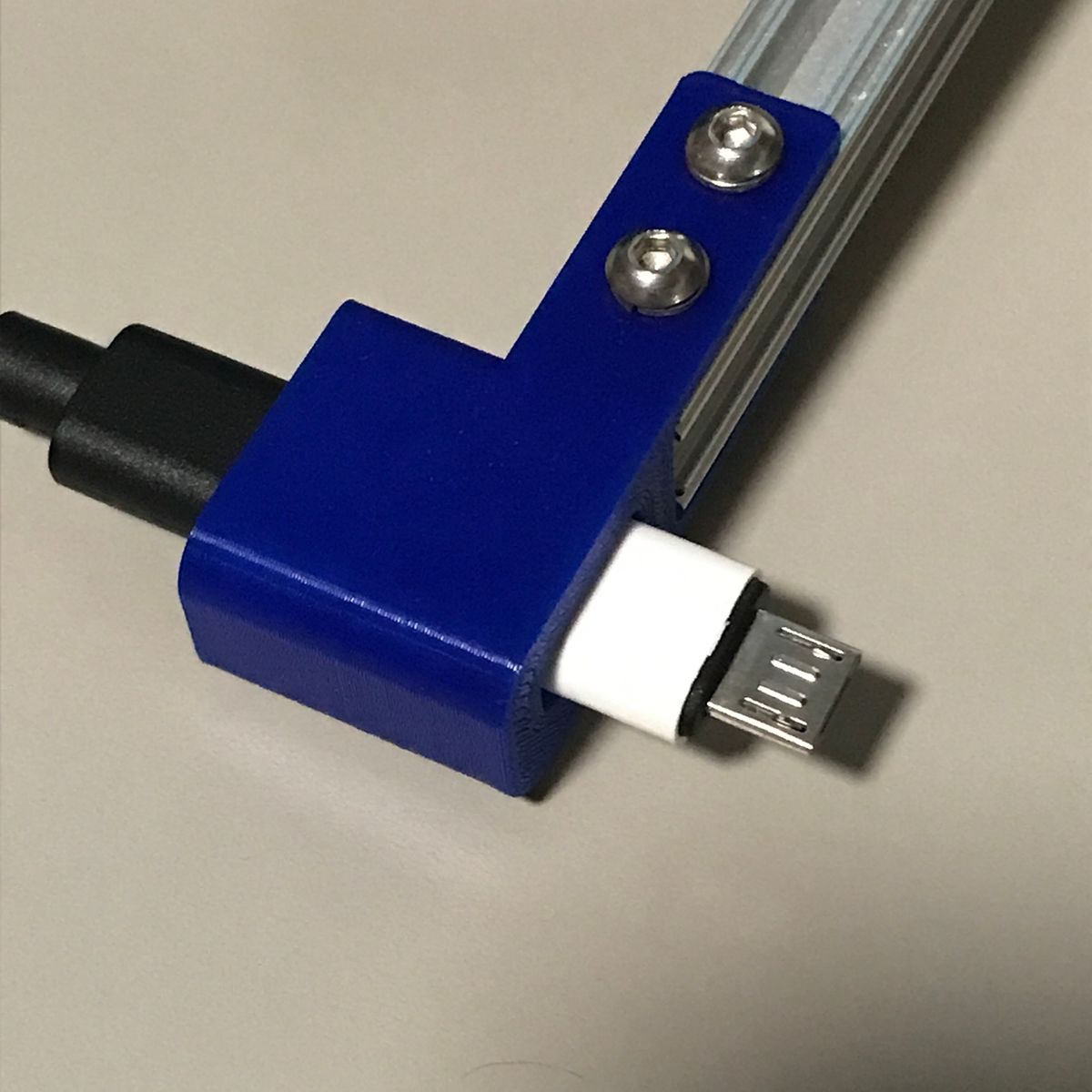 1点目はケーブルホルダ。 机の脇にUSBケーブルなどを保持するあれだ。 ケーブルホルダを作るつもりは無かったのだが、 結果としてできた物がケーブルホルダだった。 私は机の脇に10ポートのUSBハブを置き 電子工作の実験によく使うUSBケーブルを刺し 垂らしている。場所が隣の机との境界近くなので ケーブルが全部、隣の机との隙間に落ちてしまう。 使用時に取り出すのが少し面倒だし、 見た目も良くない。 隙間に蓋などすれば落ちないだろう、 いつか作ろうと思っていたが 遂に作ることにした。