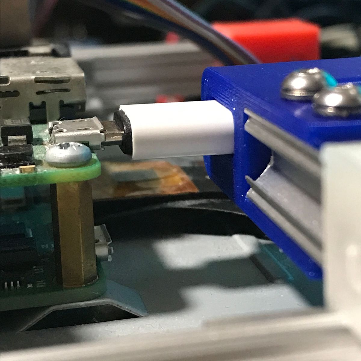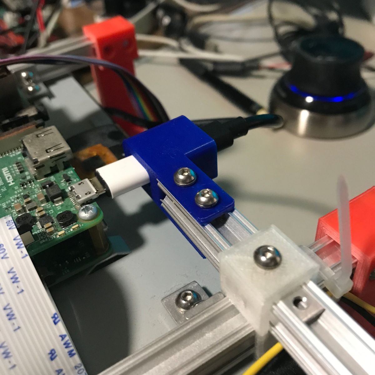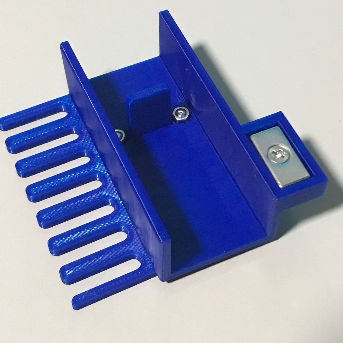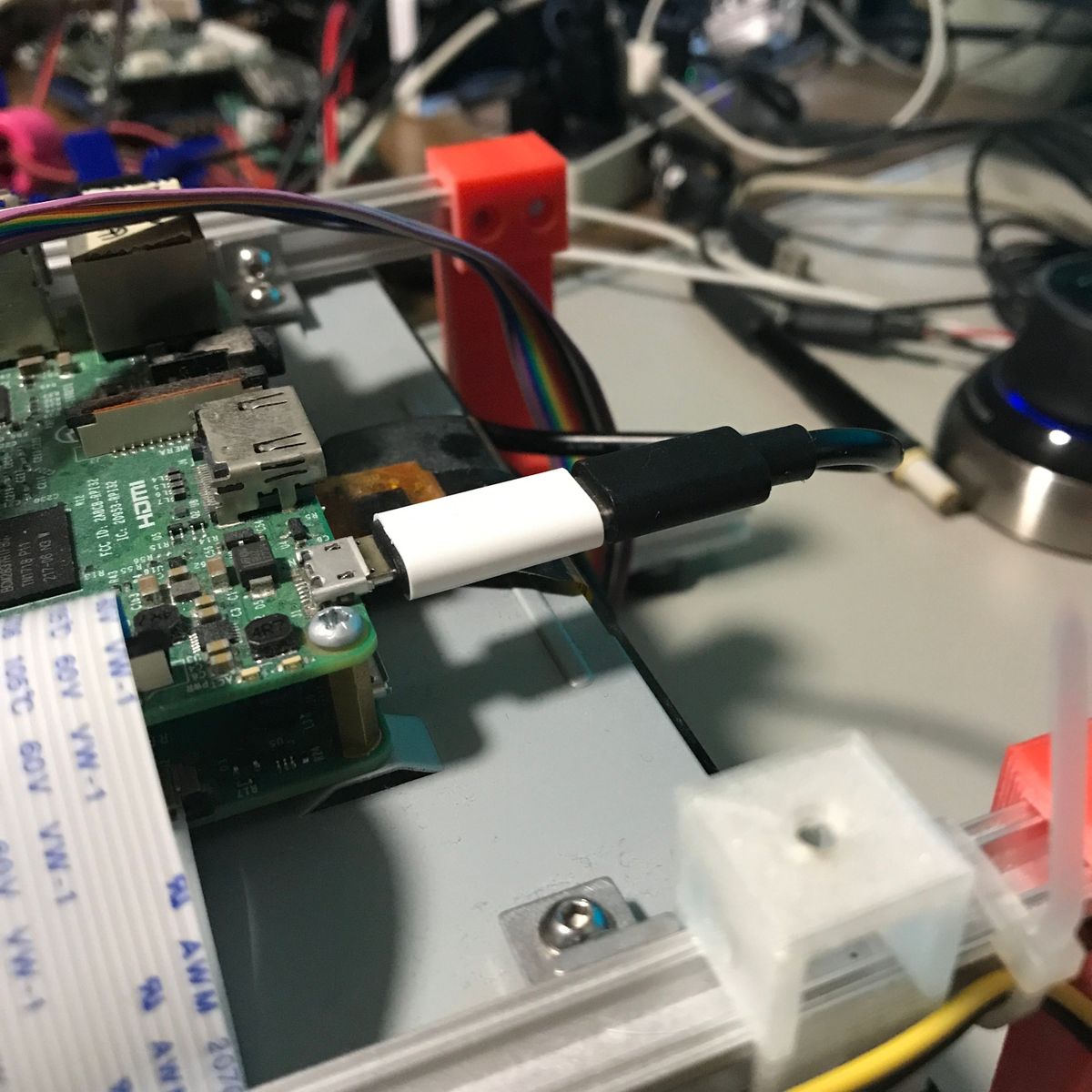 1点目はケーブルホルダ。 机の脇にUSBケーブルなどを保持するあれだ。 ケーブルホルダを作るつもりは無かったのだが、 結果としてできた物がケーブルホルダだった。 私は机の脇に10ポートのUSBハブを置き 電子工作の実験によく使うUSBケーブルを刺し 垂らしている。場所が隣の机との境界近くなので ケーブルが全部、隣の机との隙間に落ちてしまう。 使用時に取り出すのが少し面倒だし、 見た目も良くない。 隙間に蓋などすれば落ちないだろう、 いつか作ろうと思っていたが 遂に作ることにした。