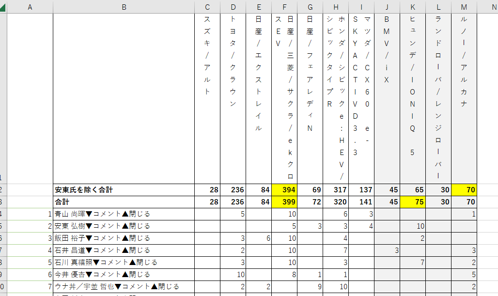 60人の審査員の投票結果が 公表されている。 すぐに消えてしまいそうなURLなので 魚拓も取っておく。 結果を集計するのに ExcelでWeb上の表を読み込む機能があると最近知ったので 試してみる。
