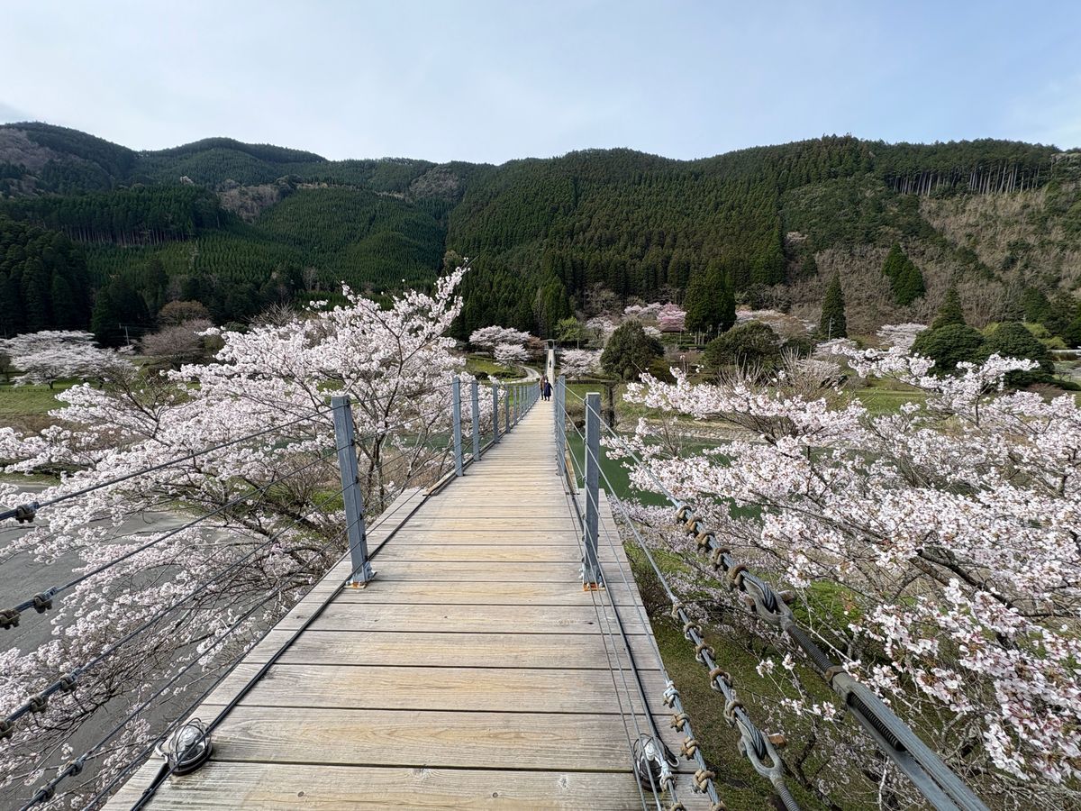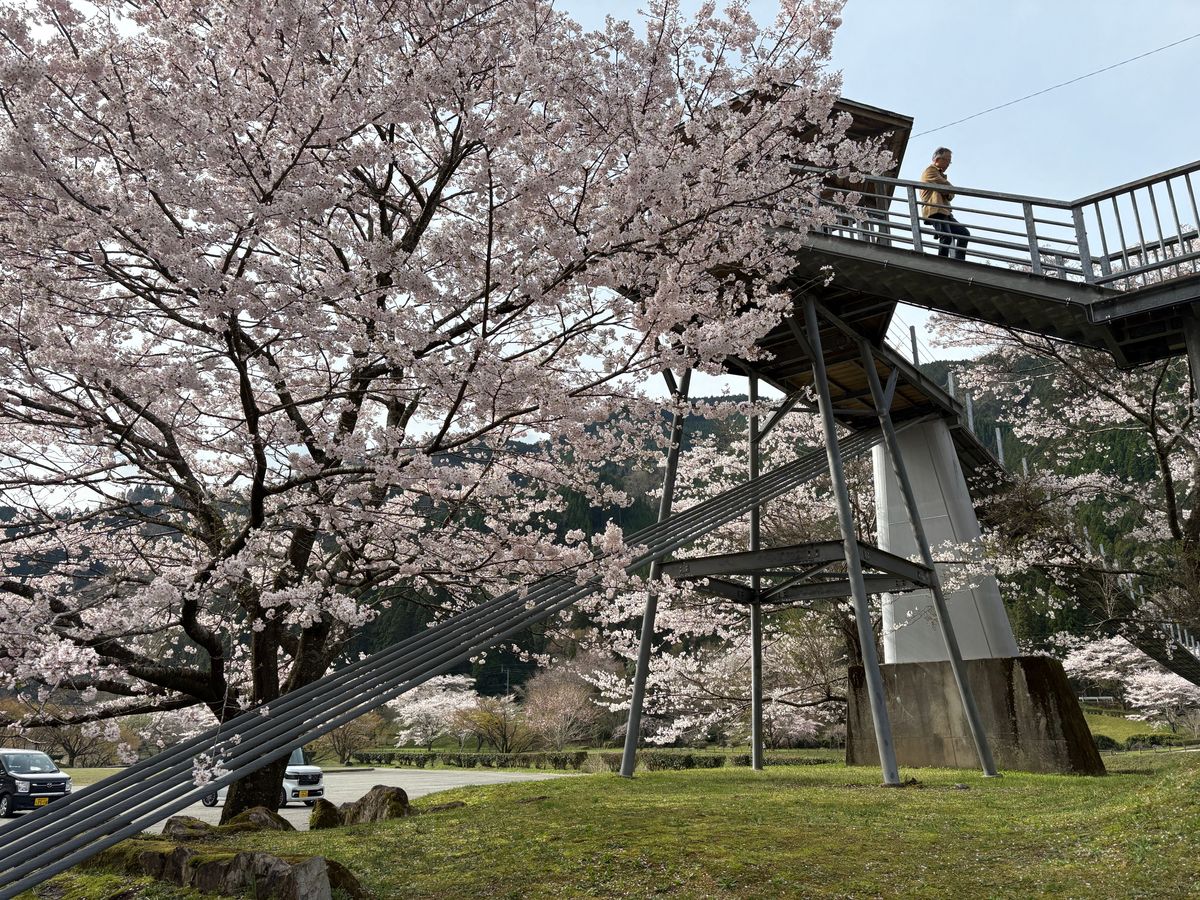 市原ダム湖を囲むように桜が植えられている。 お勧めの花見ポイントは 水輝橋のあたり。 これは湖の一部を渡ることができる歩行者専用の吊り橋で、 いちめん桜の風景を楽しむことができるし、 このあたりの駐車場が一番広い。 (動画)