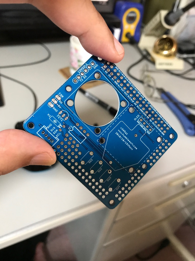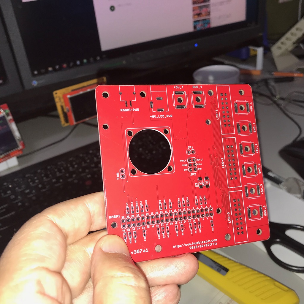 そこで、LEDの電源用端子、RasPi用FAN、外部に接続される信号に 抵抗を追加するなどした基板を設計、発注した。 果たして、春節が終わるまでに、実験は行なわれるだろうか。