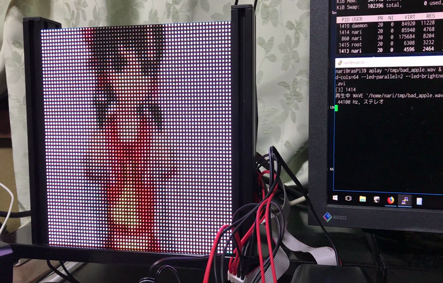 LEDとRaspberry Piの電源を完全に分離したのは良かった。 おなじ5Vの電源を2つ用意するのは面倒だが、 LED側電源が容量不足で電圧低下が起こっても、 RasPi側には影響ないのは安心だ。 動画では 64x64dot, 1/16スキャン、 LEDの消費電流は20mAなので、 全点灯時は 64 x 64 x 3 / 16 x 20 [mA] = 15.36[A]の電流が 流れる。これだとACアダプタでは間に合わない。配線も大変だ。