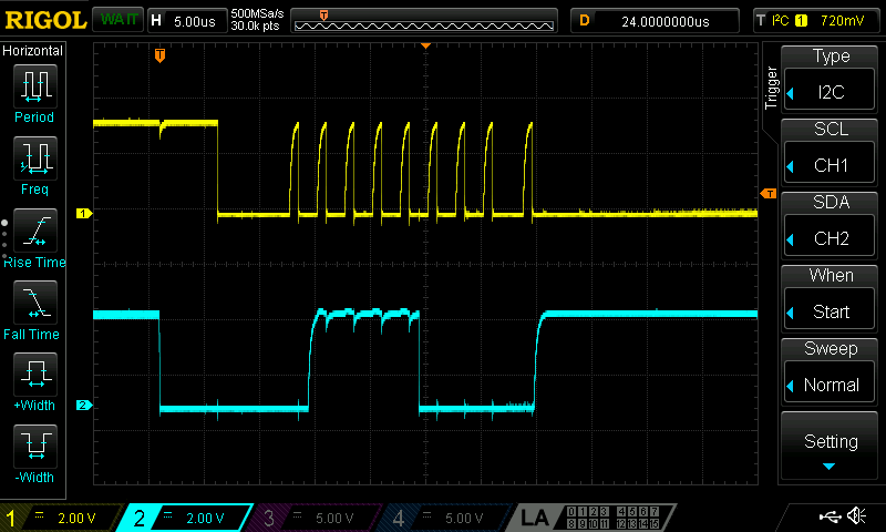 まず、I2Cでレジスタの読み出しを行う。 読み出したいレジスタのアドレス1byteを書き込んだ後、 セッションを終了せずに2byte読み出すことでできる。 それっぽい値を読み出すことができた。