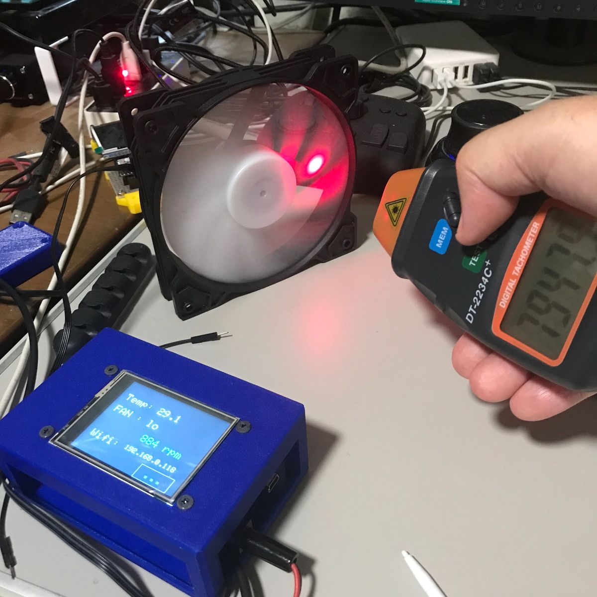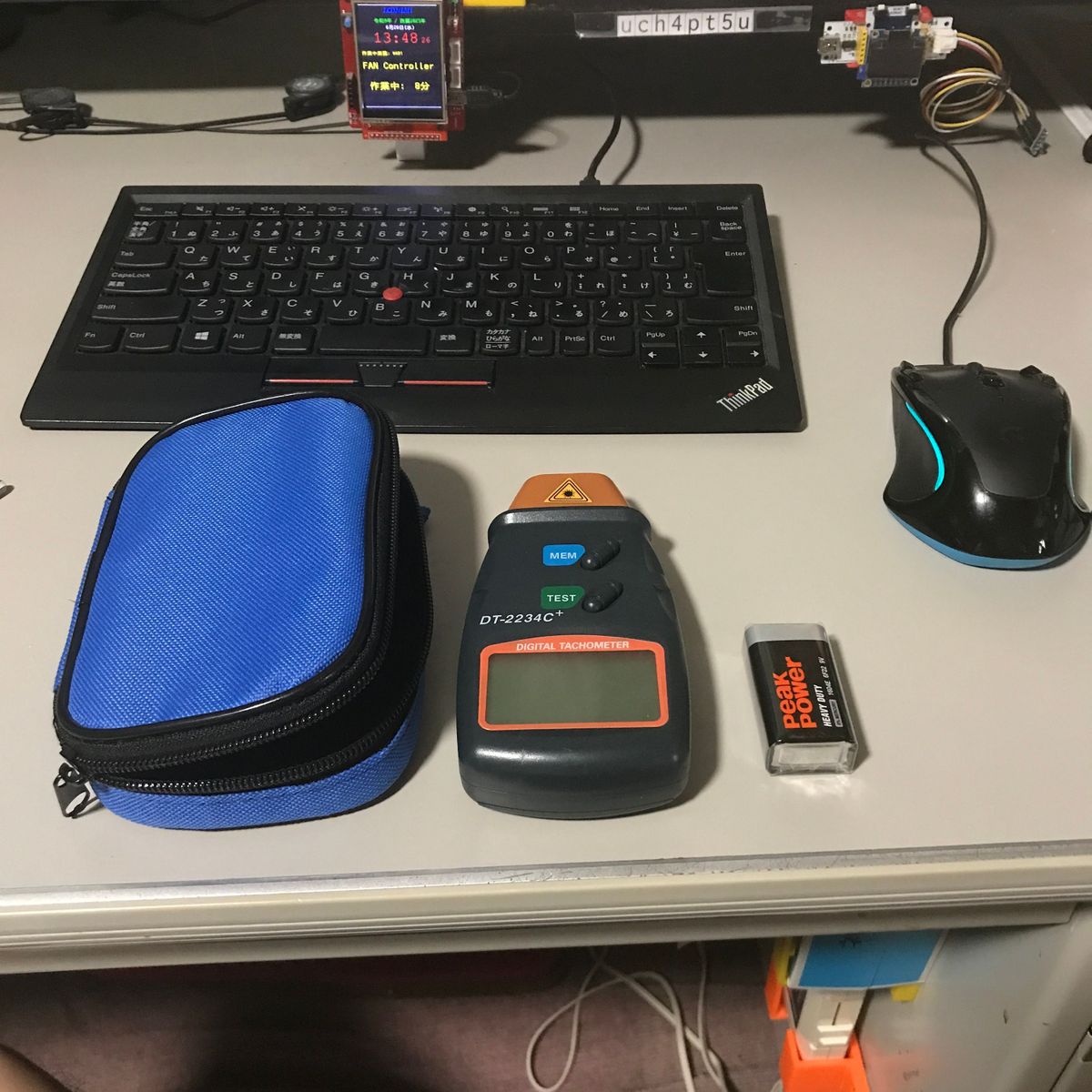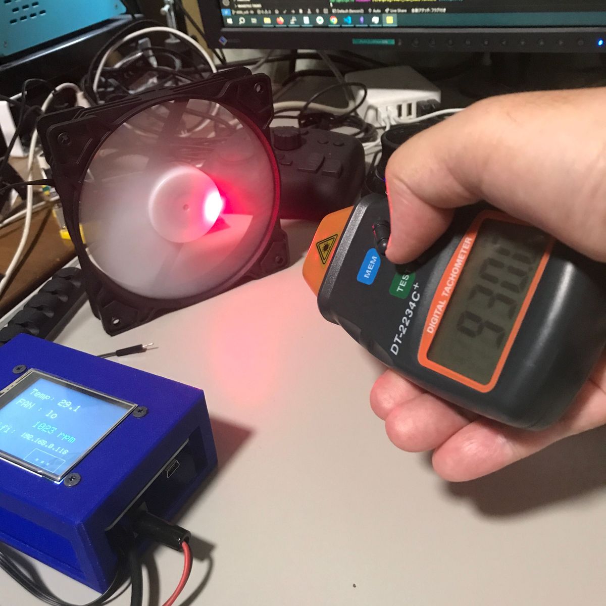 まだ FANコントローラをいじっている。 ESP32仕様でLCDもついているタイプの奴。 これはFANからのパルス信号で FANの回転速度がわかるのだが、 1回転が何パルスなのかがわからない。 フォトトランジスタでファンの影を検出し、 回転時の信号の周波数をオシロスコープで計測してやれば良いと 思うのだがブレッドボードで回路を組むのがメンドクサイ。 安い回転数計があれば、この機会に買っても良い。 調べると 1,554円のものがあるので買ってみた。