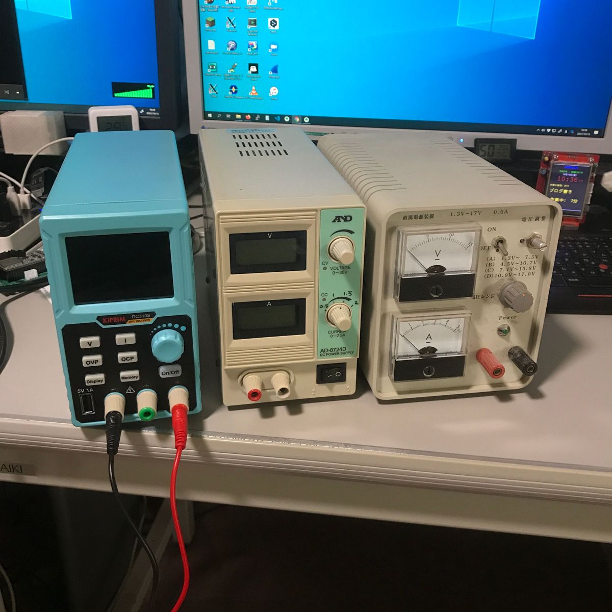 動画では2.5Aの実験用電源を使用しているが、電流超過で しばしば電圧が下がって、表示が赤っぽくなっているのがわかる。 電圧が下がると赤っぽくなるのは、赤色LEDのVfが2V程度で 青色、緑色の4V程度と比べると低いため、電圧が下がると 赤色のみ明るく光るため。