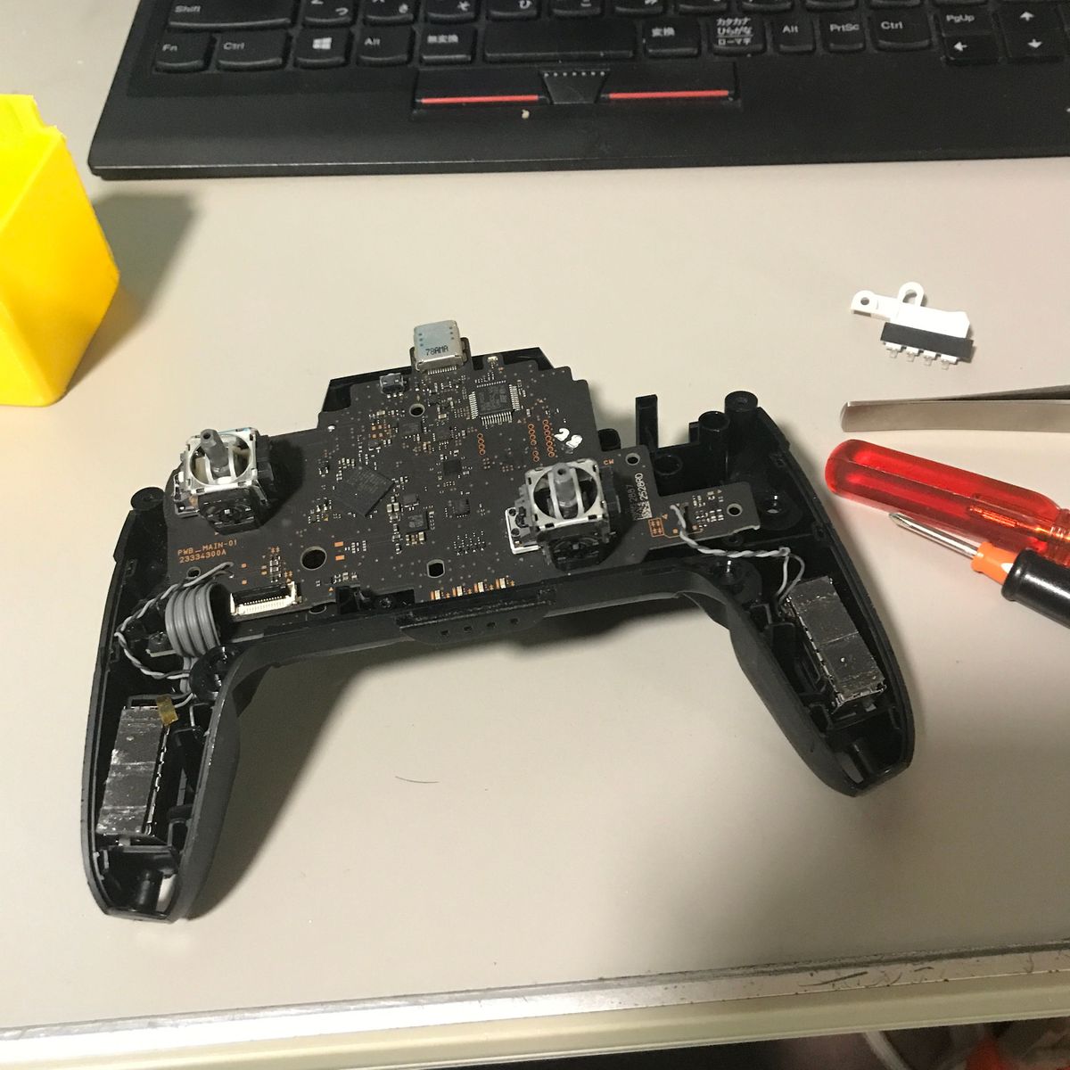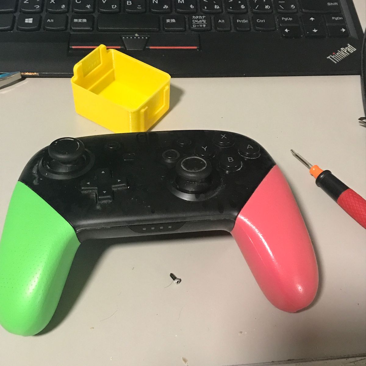 現物が届いて、両面テープで固定するタイプであることに気付いた。 あまり机に両面テープで固定したりしたくない。 しばらく考えて、手持ちのネオジム磁石を2個両面テープ貼り付け、 これで固定することにする。良い感じだ。