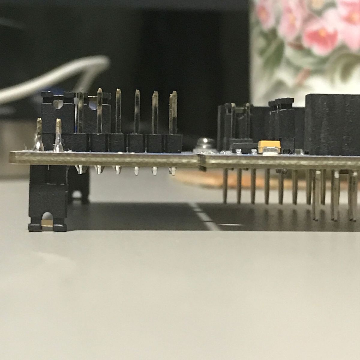 プログラムを動かすと、多少は改善されたが、表示されないことが多い。Wiresharkで見ると、パケットが欠落している感じ。電源の容量不足を疑い、5Vのラインや3.3Vのラインを強化してみたところ、改善は見られるが、基板の位置、角度によって通信できたり出来なかったりする感じ。