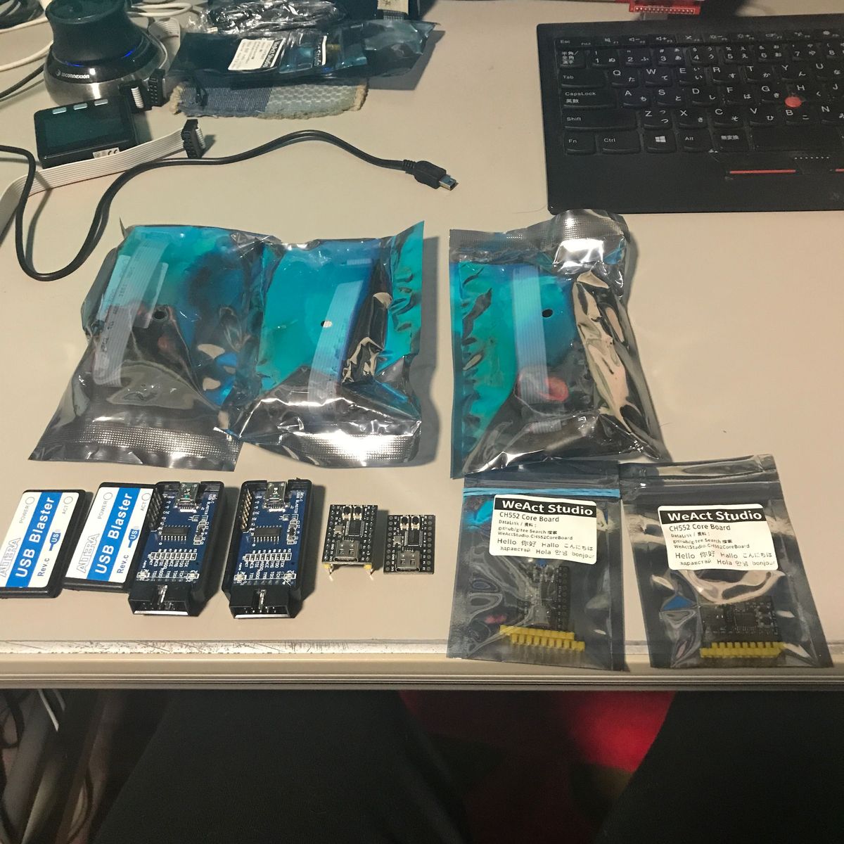CH552使用の互換USB Blasterが動かない件調査のため AliExpressに注文したものが到着した。 購入したのは CH552 ミニコアボード 199円 × 4個と 互換USB Blaster 225円 × 4個。 1個でよかったのだが1個の価格では 迅速配送が利用できず到着に時間がかかりそうだったので 迅速配送が利用できる最低量を購入した。 ちなみに迅速配送料は 459円と728円。1週間程度で届いた。 互換USB BlasterはCH552使用で前に購入したものと 同じで期待通り。