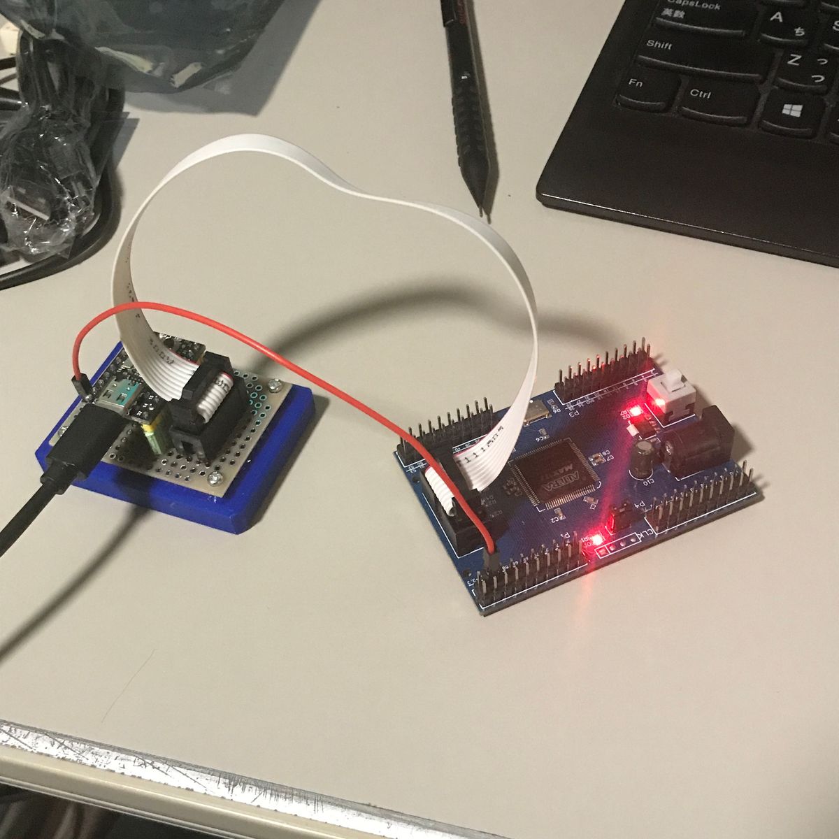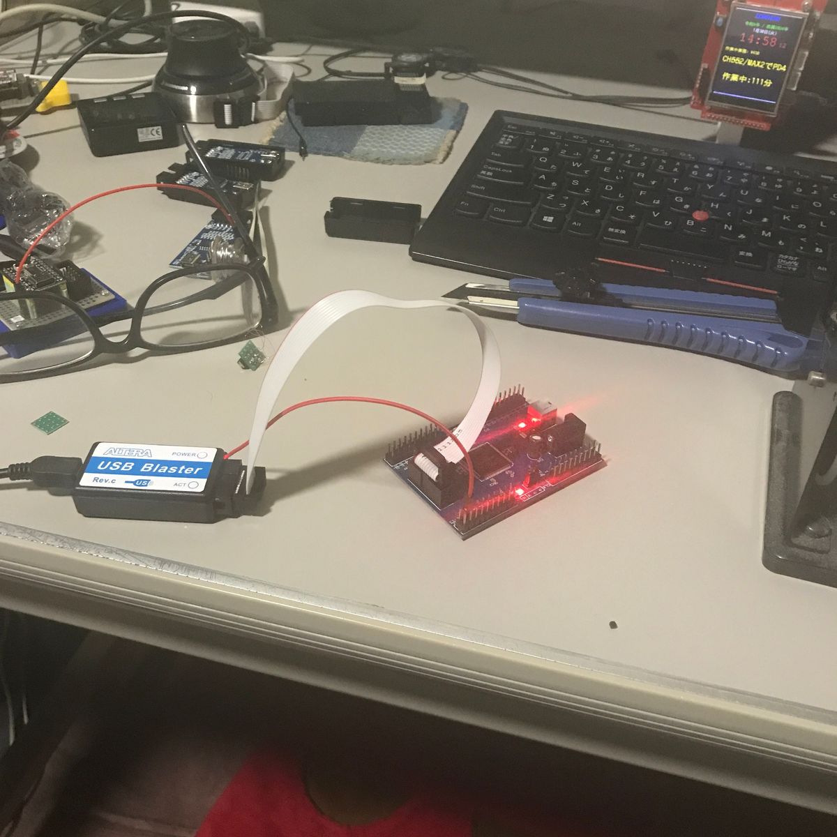 CH552 ミニコアボードに CH55x-USB-Blaster のHEXファイルを書き込んだら Intel Quartus Prime Lite EditionにUSB-Blasterとして認識された。 期待を持たせる展開だ。 ドライバーは Intel Quartus Prime Lite Edition同梱のもの。 MAX2ボードのJTAG端子と ブレッドボードとジャンパーピンで 1KΩの抵抗を介し接続。 (TMS - P1.4, TCK - P1.7, TDI - P1.5, TDO - P1.6) 不安定ながらも、なんとか書き込みに成功した。 その後、ミニコアボードと10ピンフラットケーブルコネクタを ユニバーサル基板上に配線し直したところ 安定して書き込みができるようになった。