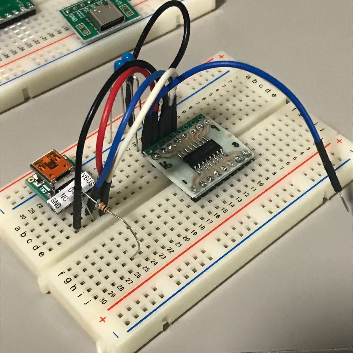 次に、CH552GとUSBコネクタのみの回路で 動作するか実験を行うため必要な部品、 SOP16変換基板, ミニBメスUSBコネクタDIP化キットと CH552P DIP化キットをついでに購入。 ブレッドボード上で実験したところ CH552P + USBコネクタで動作、 CH552G + USBコネクタでも動作した。