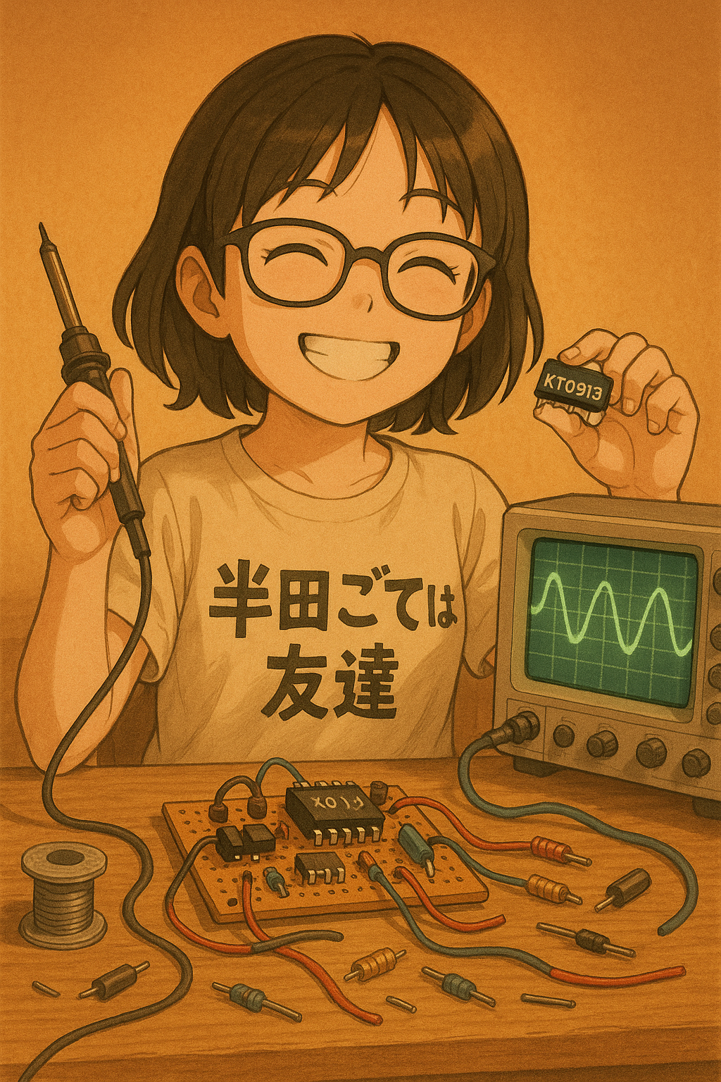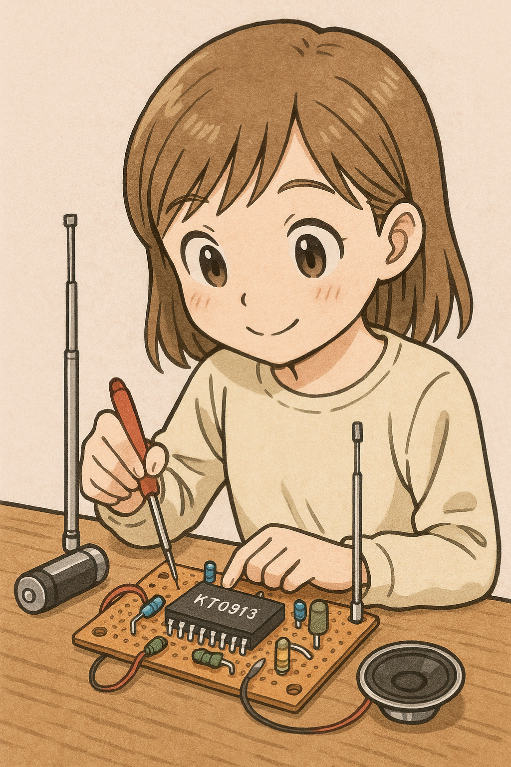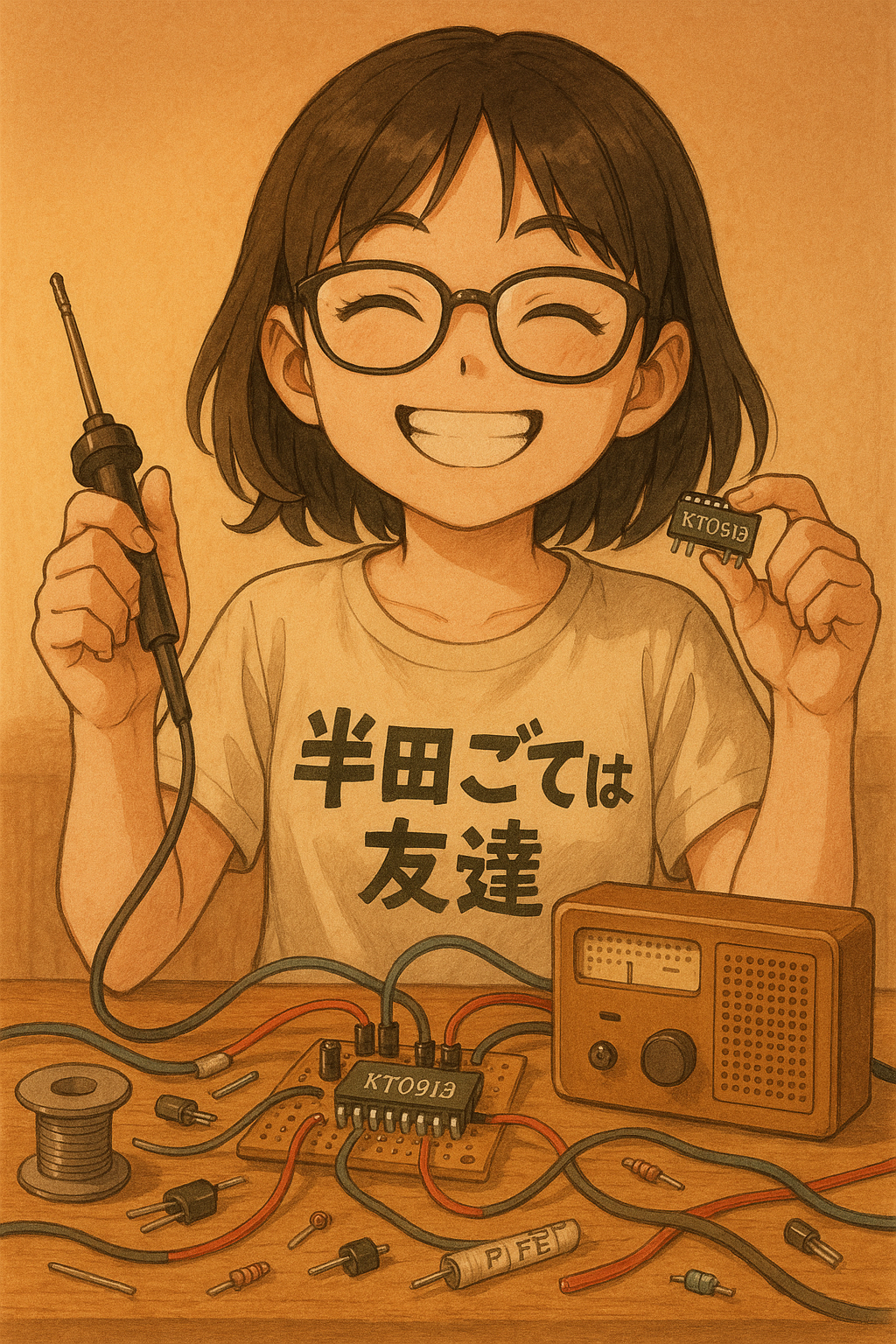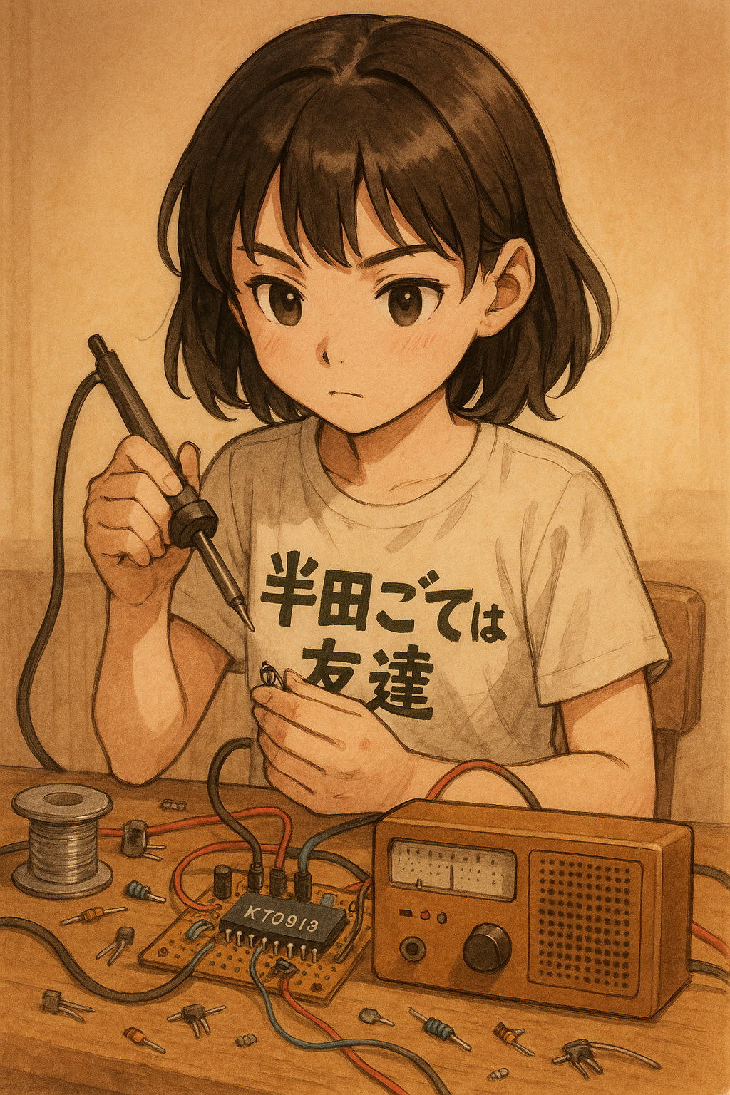 OpenAIで KT0913でラジオを自作する女の子のイラストを書いてみた。