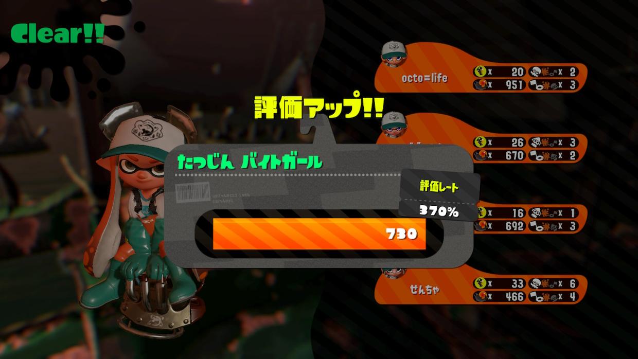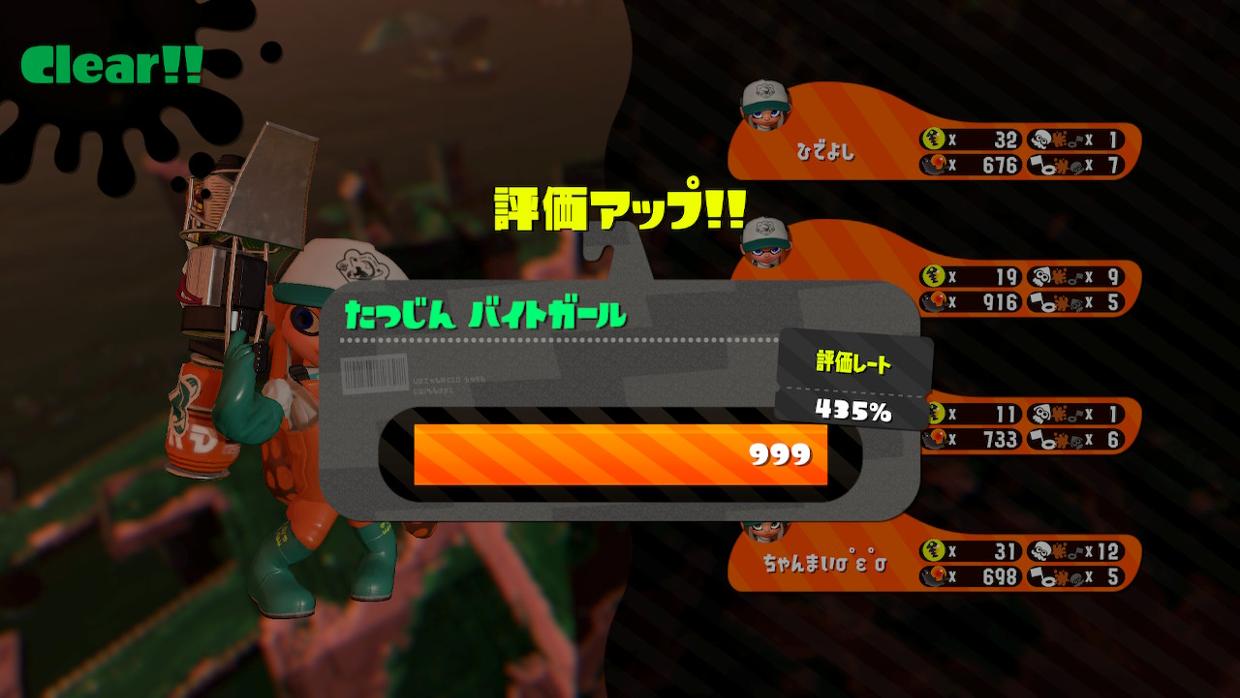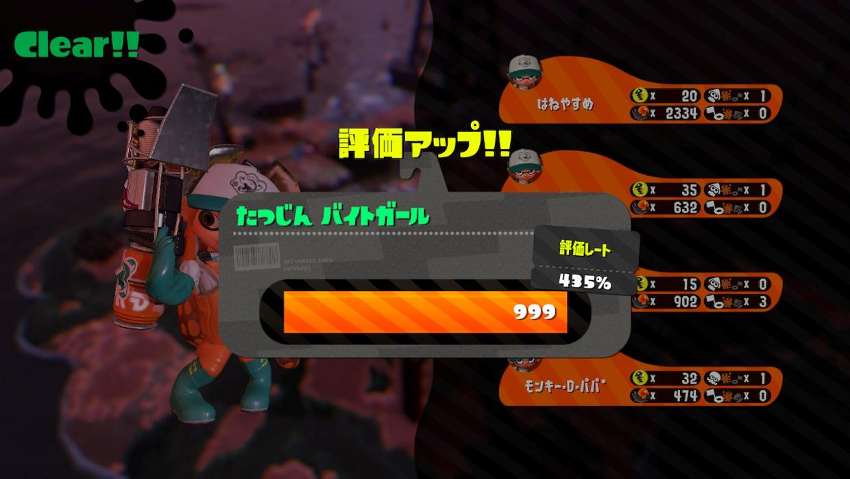 現在の最高到達レベルは達人の380ぐらい。 金イクラ最高獲得数は99個。 クリアしたことがある1st Waveのノルマは18くらいかな。 ノルマ12ぐらいまでは、大体勝てて、13ぐらいから怪しくなる。
