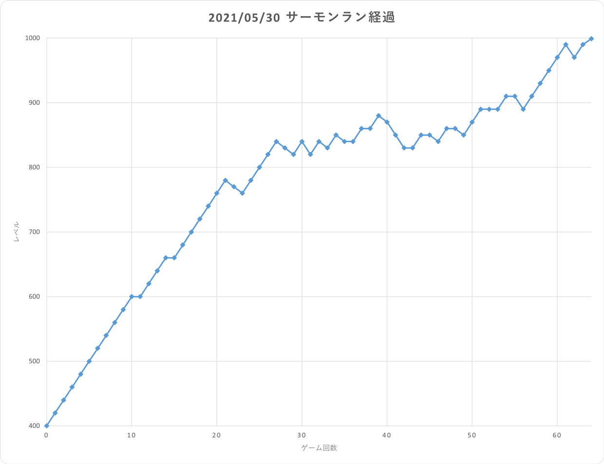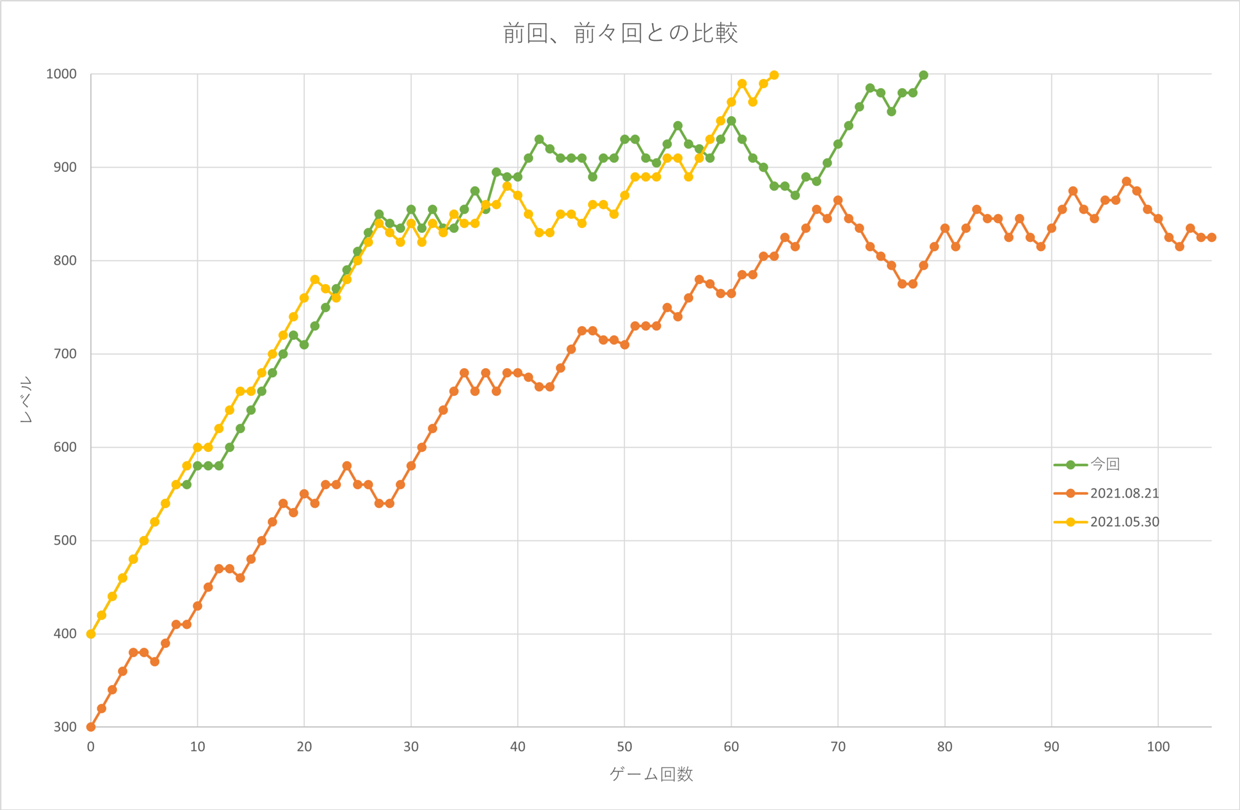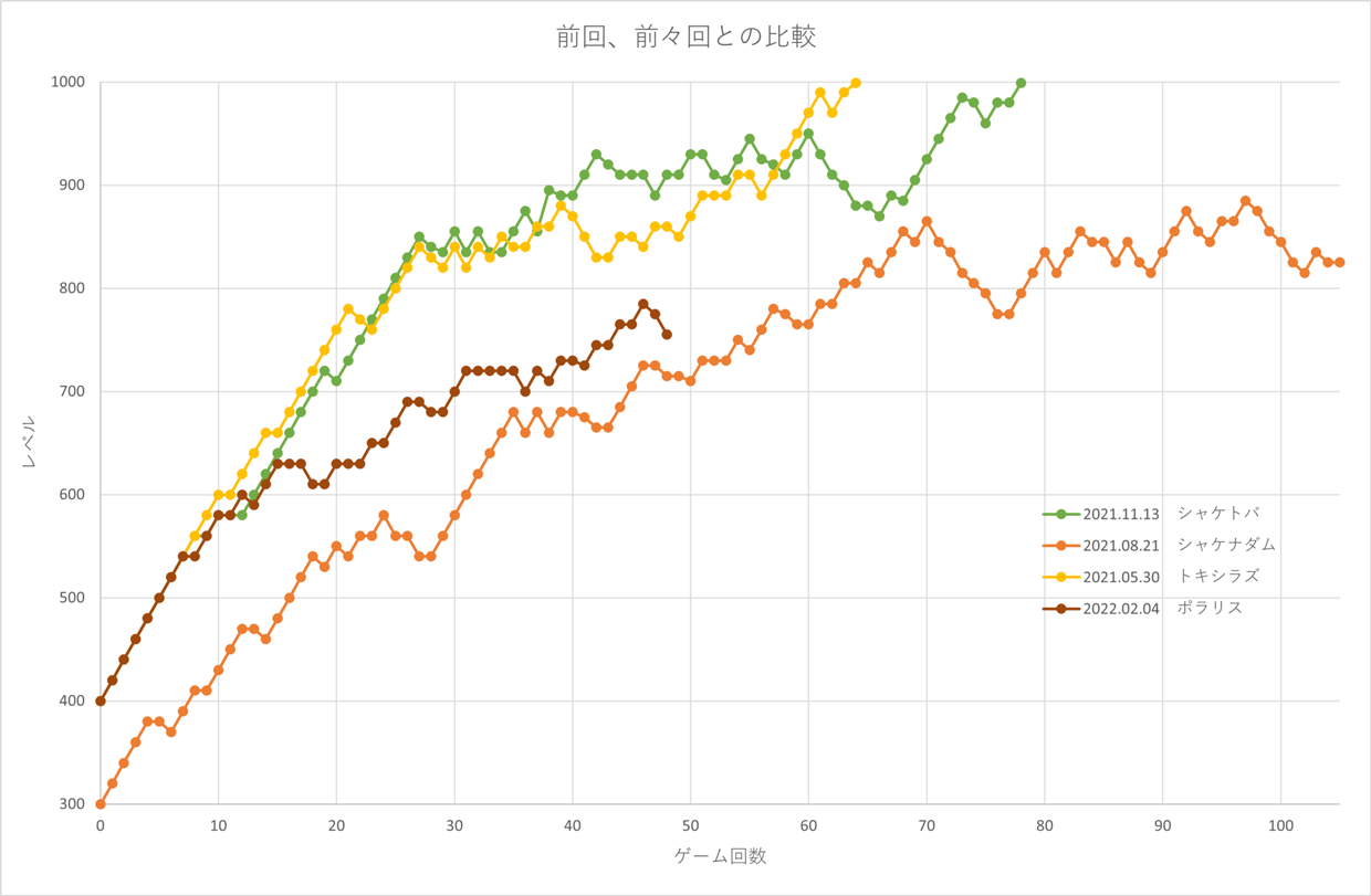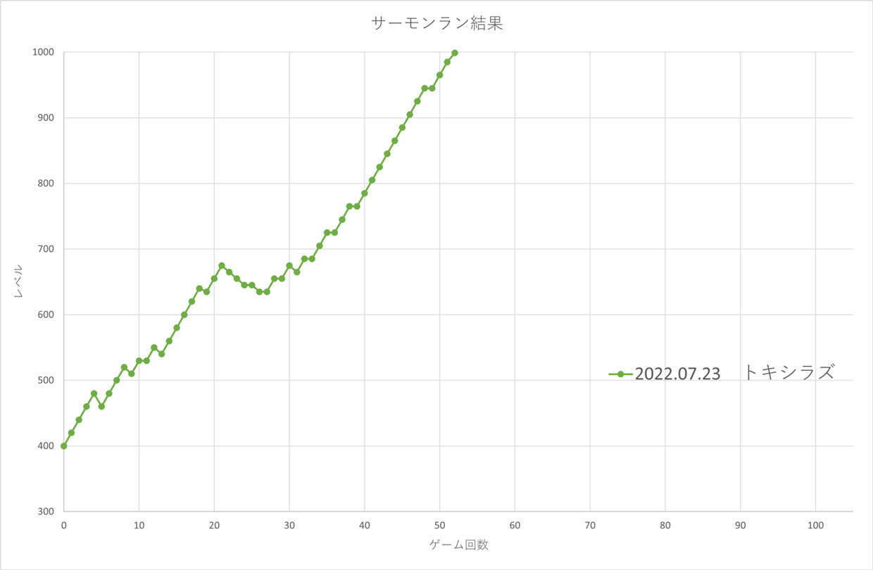 前回はシャケナダムで難しいと感じ23ゲームで 止めてしまったのだが、比較すると大差ない。 時間帯を選び続ければ、もっと高いレベルに行けたのではないかと 思ってしまう。 時間はかかるが100ゲームぐらいはやっておきたい。