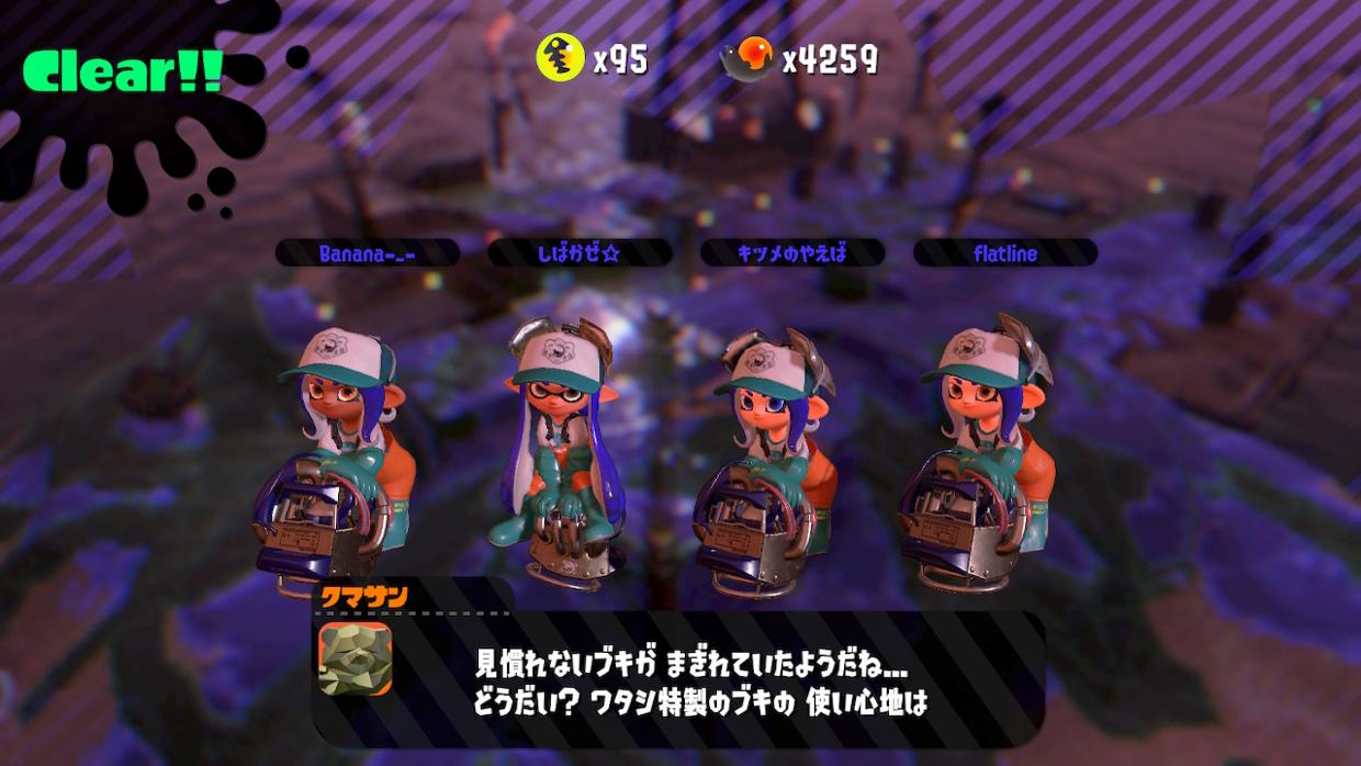 今週の土日、スプラトゥーン2のサーモンランで 武器がクマサン印の特性武器4種 (ブラスタ、シェルタ、チャージャ、スロッシャー)という 所謂サーモンラン・フェスが行われた。 前回が7月だったので3ヶ月ぶりだ。