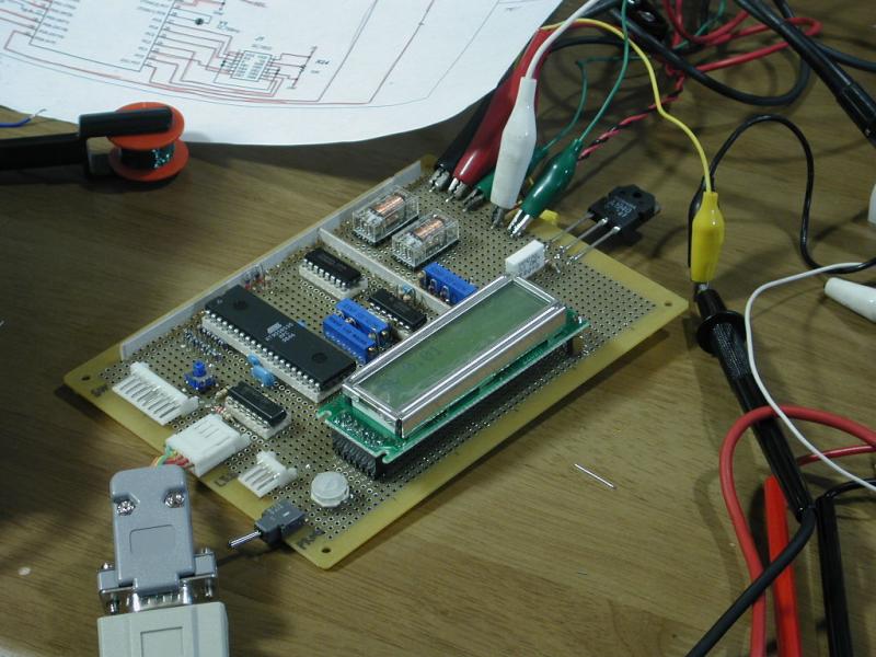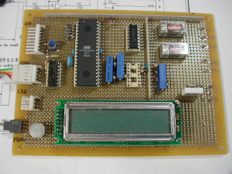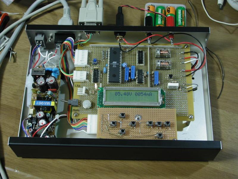 AVRのプログラム完成、といっても まだ実験用のプログラム。 RS232C経由で電池の充放電/充放電電流の設定/電流の測定/電圧の測定/ LCDディスプレイへの表示などができる。 いずれスタンドアロンで動かす予定。 OPアンプとトランジスタを とりつけたところちゃんと動作しているようだ。 定電流回路が 一発で動いたのはちょっと意外。 パソコンからコントロールして、充放電特性をいろいろ計って見たい。 NiMHの内部抵抗って意外と大きいような気がするのよね。 ケースもそろそろ用意しよう。