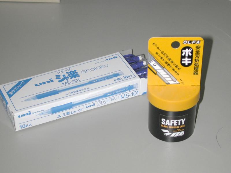 シャープペン 1箱10本と、カッターナイフの刃処理器(捨て場?)