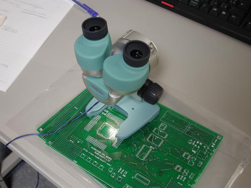 昼過ぎ、基板到着。 火曜日に注文して、月曜日着なので1週間かかっていない。 早すぎ。 次の作業の準備ができていない... さっそく、実体顕微鏡でチェック。 顕微鏡を基板の上にのっけても、ちゃんとピントが合う。 エライ! 細かいミスはいくつかあるが、大体よさそうだ。