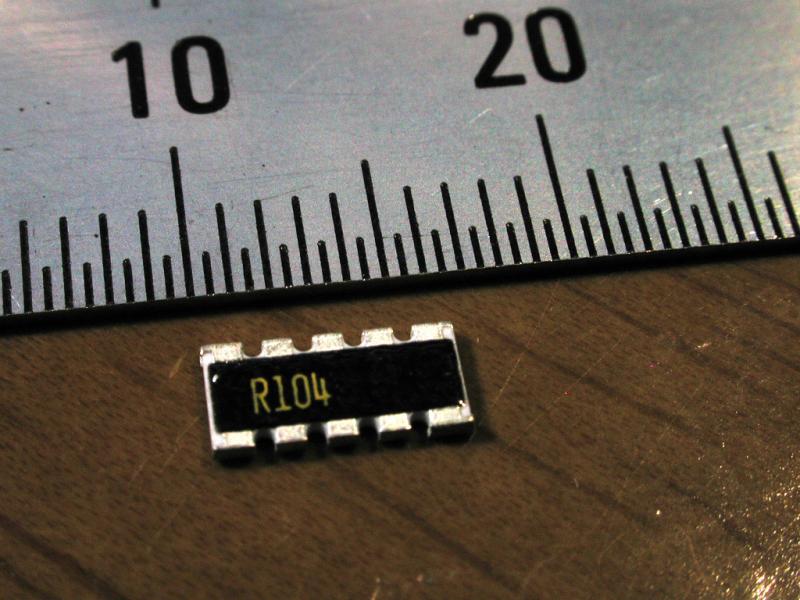 現品.comより部品到着。 待っていたのは 100KΩのチップ集合抵抗 (写真a)。 50個で390円。 形状を頼りに調べると rohmのMNR35あたりらしい。 とすると抵抗8個分。 これでメインのプロジェクトも再開だ。