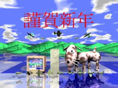 部品としてはまず犬です。 1994年の干支は犬ですから必須(^_^;)です。 楕円と円柱の組合せですが、なんとか姪たちも犬とわかってくれました。 次に、わたしが作った物であることがわかるように、パソコン GATEWAY-2000を 作りました。 ディスプレイはMAG-17Sです。 背景は、悩んだのですが、当時 山歩きに凝っていたので山にしています。 なにげなく配置されているようですが、山の座標と高さは熊本周辺の実際のやまの位置と高さのデータからとっています。(でも、関係なかったですね) そらは、povrayのサンプルにあった『雲付きの空』です。 余力があったので、簡単に作った飛行機をたくさんとばしてあります。 最後に苦労したのが『謹賀新年』の文字。 当時 Photoshop等のお絵書きソフトを 持っていなかったので、Postscriptで直接書いた『謹賀新年』の4文字をghostscriptで ppmファイルにして、それをgifに変換しました。 色付けは最後にxvのcolor editでやりました。 この絵を一晩かけてFullscreenサイズ(1024x768)でレンダリングし、1眼レフのカメラ で取って 年賀状にしました。