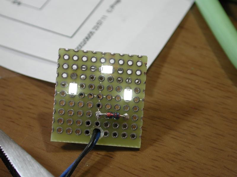 できあがり これで、出来上がった状態です。 電源は、わに口クリップからとる。 チップLEDを3個直列にしたので、 12Vぐらいの電源が必要になる。 並列にすれば5Vぐらいでも光るはず。