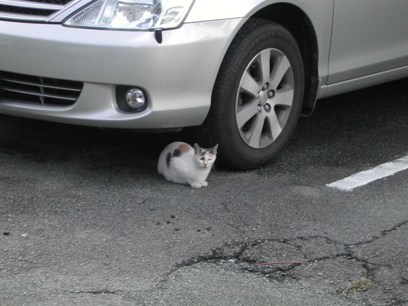 夕方、事務所のマンション裏の駐車場の壁の上に変な動物発見。
